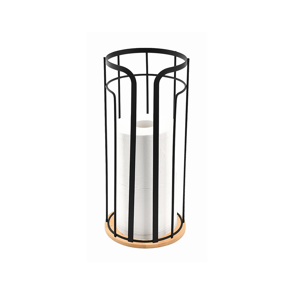 Szabadon álló WC-papírtartó, fekete lakkozott drótból. A kerek talp nagy stabilitást biztosít az állványnak. Az állvány alapja elszigeteli a papírt a padlótól. Az alap csúszásgátló betétekkel rendelkezik. 3 papírtekercset tárol. Összeszerelést nem igényel.