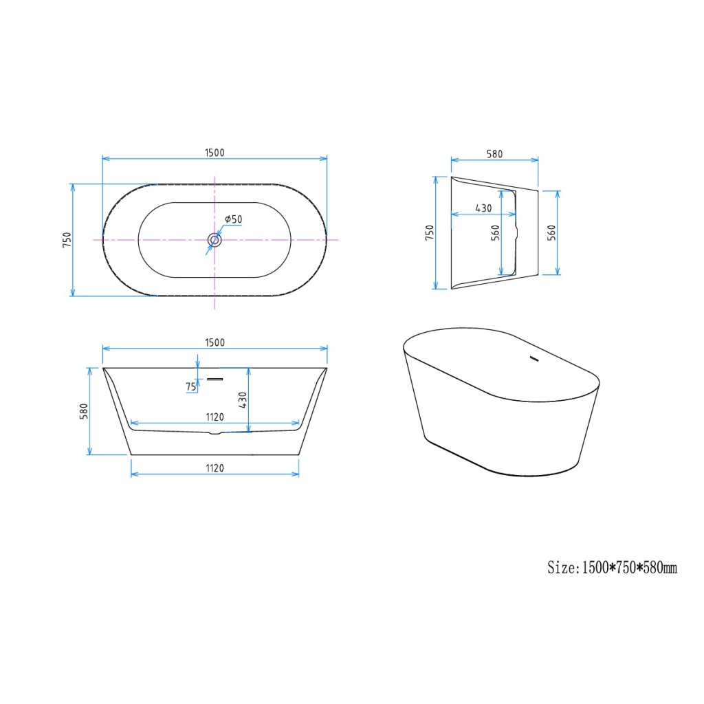Erga Rhea, szabadon álló kád 150x75 cm + lefolyódugó, fényes fehér, ERG-RHEA-150075-WH-WH