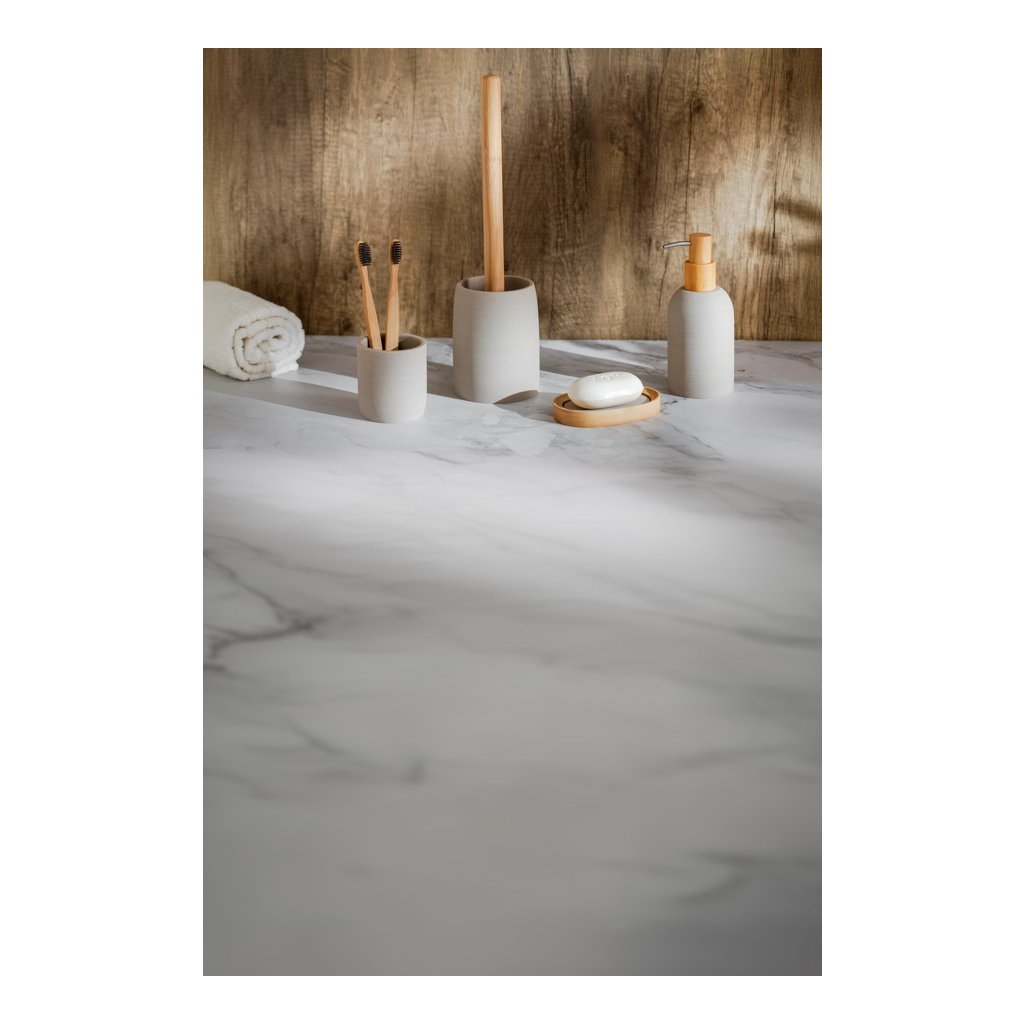 A RIKO kollekció egy 4 részes polirezinből készült készlet bambusz elemekkel, elegáns bézs színben. Egyszerűségével és dekoratív vízszintes csíkjaival tűnik ki, amelyek tökéletesen harmonizálnak a természetes anyaggal. Az egyedi minimalista felület felkelti az esztéták figyelmét, a kézzel faragott részleteket idéző minta pedig jellegzetes karaktert kölcsönöz a kollekciónak.