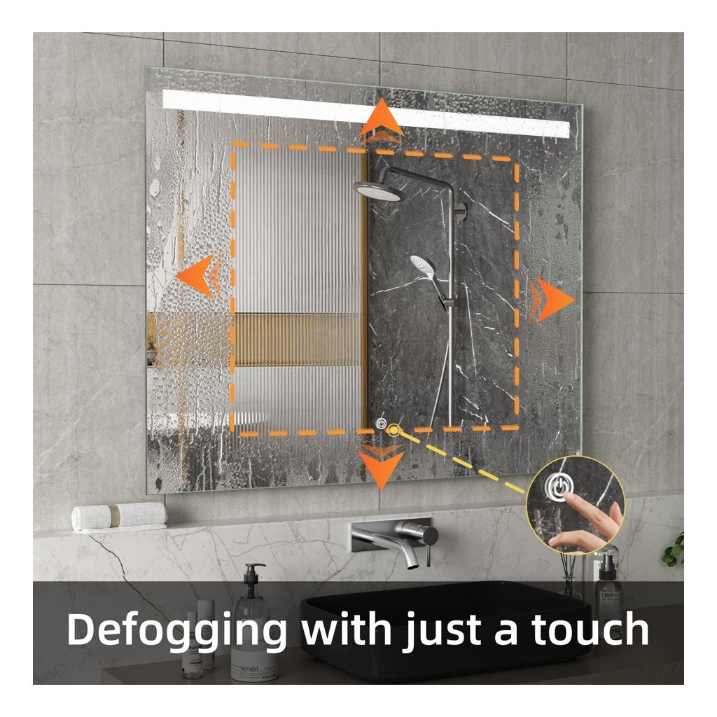 - Ez a LED-es tükör fényereje szabályozható, érintésérzékelős kapcsolóval vezérelhető. Egyszerűen nyomja meg a bekapcsológombot 2-3 másodpercig a fényerő 10%-ról 100%-ra történő állításához. A fényerő-beállítások automatikusan mentésre kerülnek, így nem kell minden alkalommal módosítania a fényerőt.