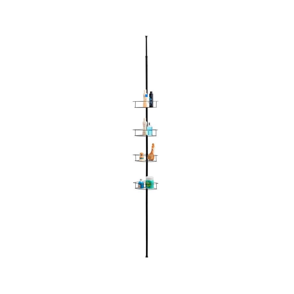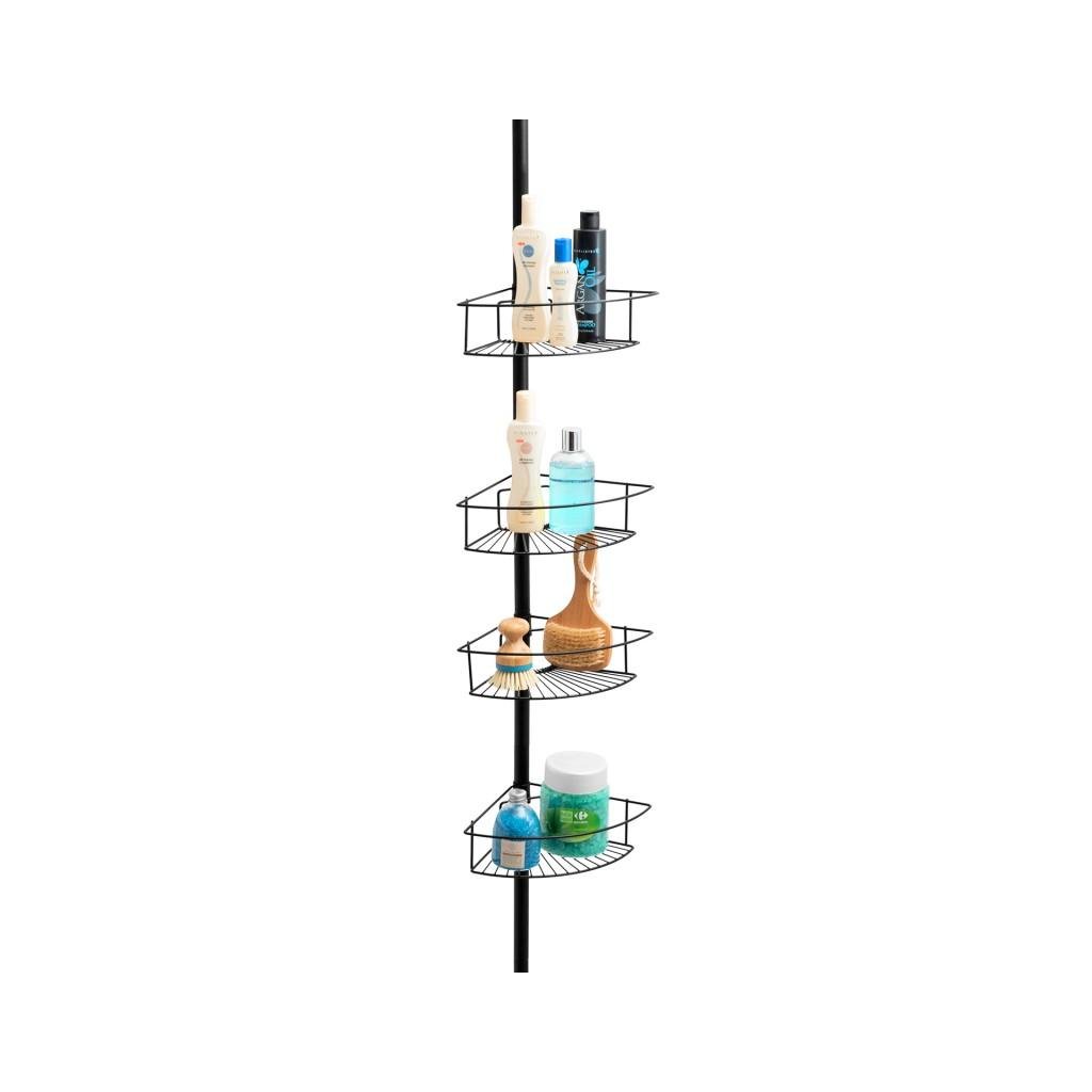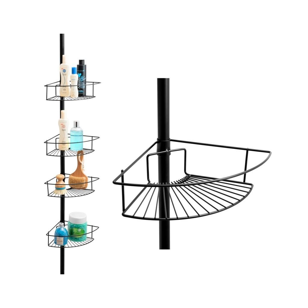 Teleszkópos sarok fürdőszobai polc. A zuhanyzó sarokba vagy a fürdőszoba sarkába szerelhető. Fekete porszórt acélból készült. Elegendő helyet biztosít a fürdőszobai kiegészítők számára. 4 sarokkosárral rendelkezik a fürdőszobai kiegészítők számára.