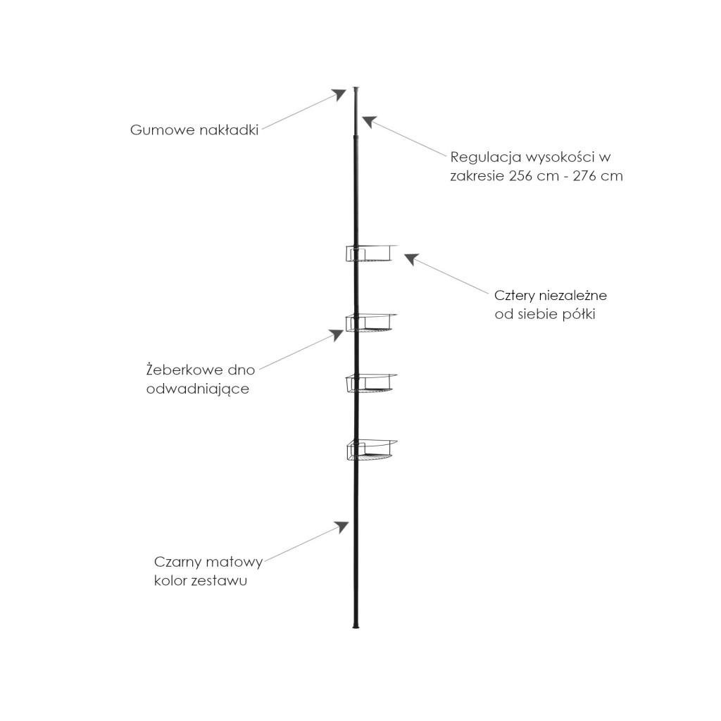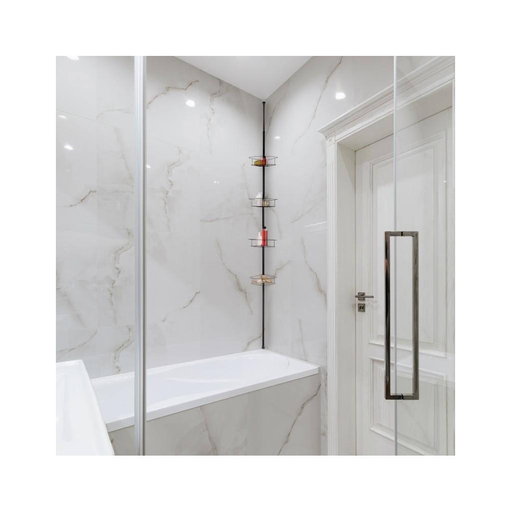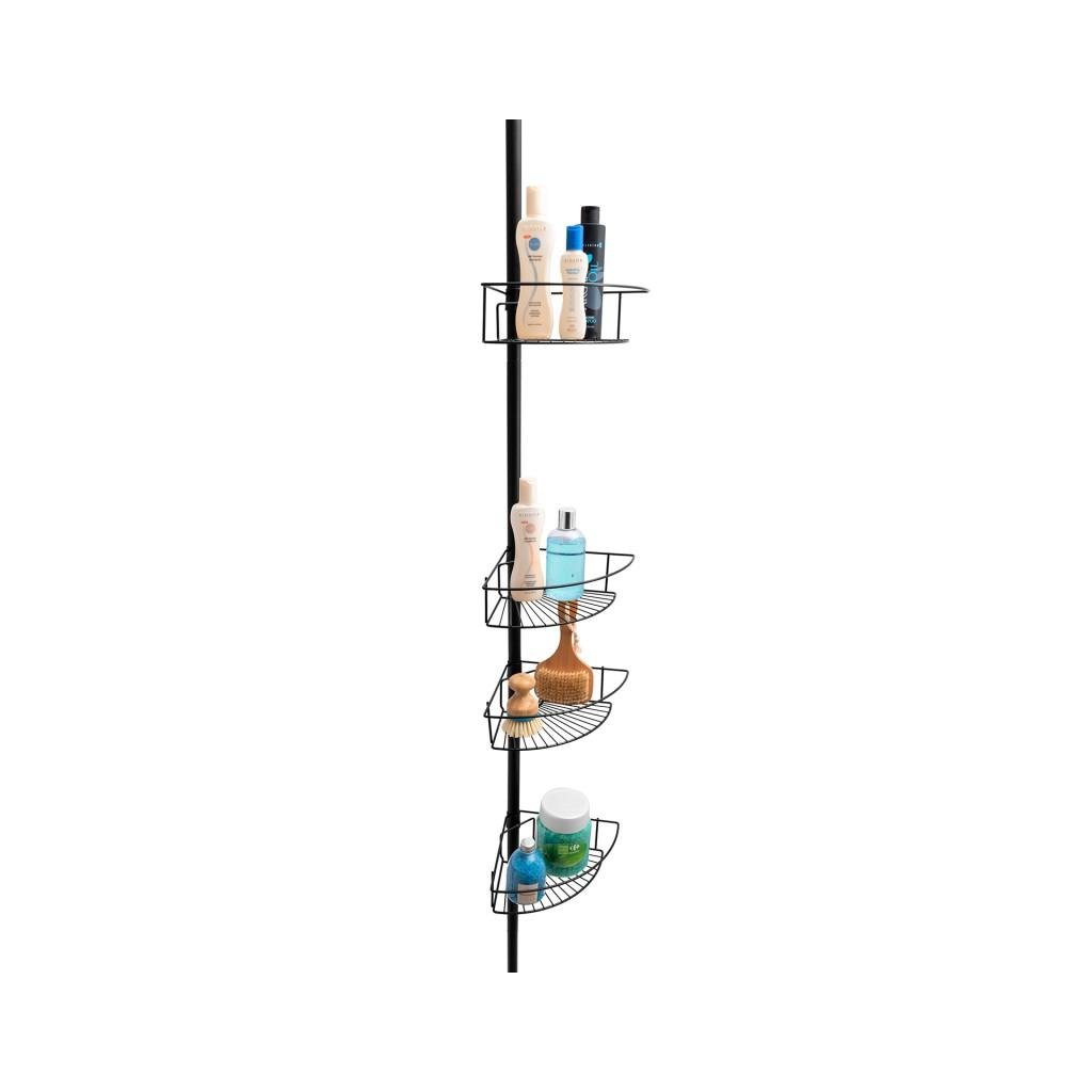 Teleszkópos sarok fürdőszobai polc. A zuhanyzó sarokba vagy a fürdőszoba sarkába szerelhető. Fekete porszórt acélból készült. Elegendő helyet biztosít a fürdőszobai kiegészítők számára. 4 sarokkosárral rendelkezik a fürdőszobai kiegészítők számára.