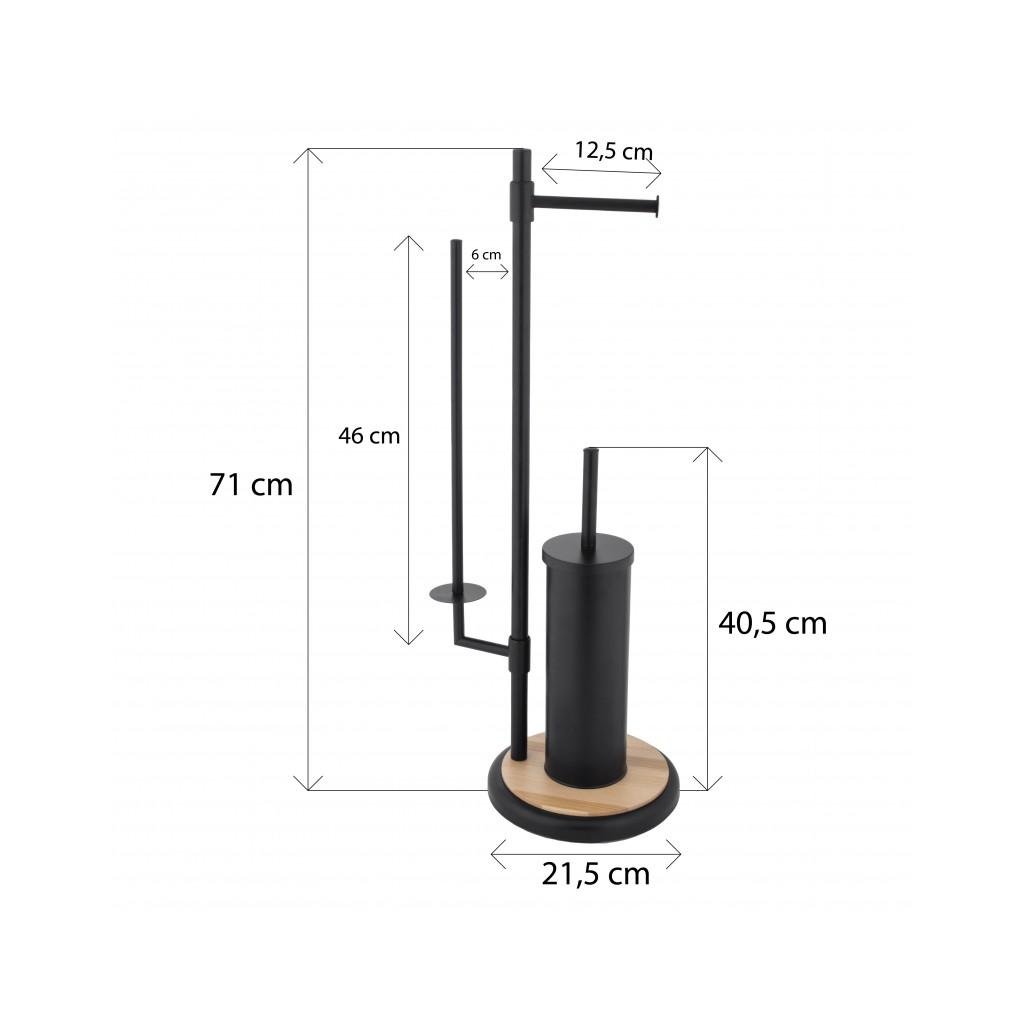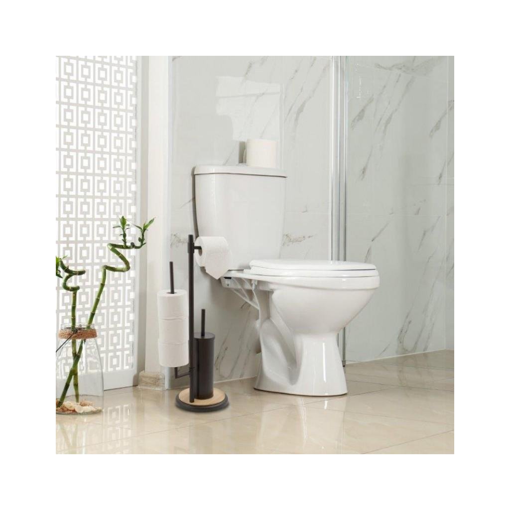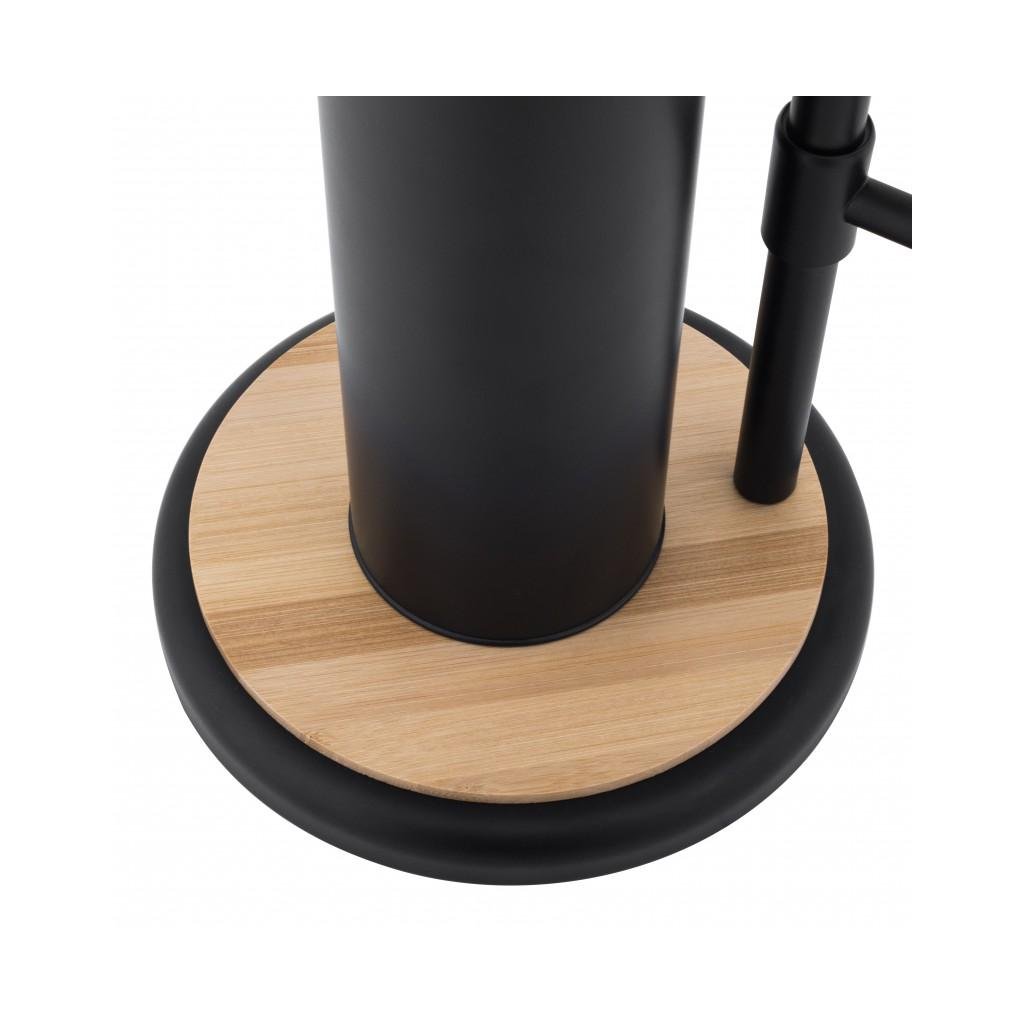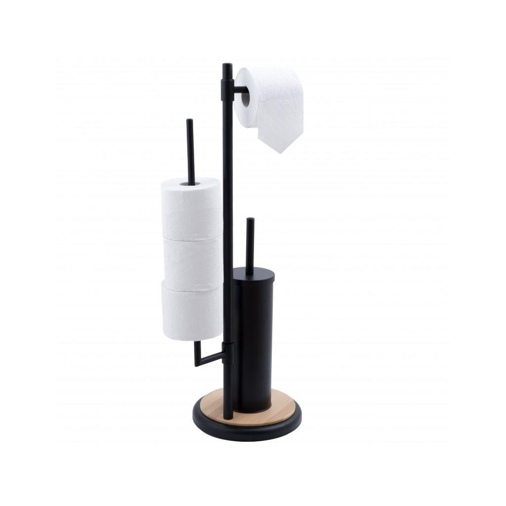 Elegáns állvány tartalék WC-papír tárolására extra WC-kefével és tekercstartóval. Az állvány kiváló minőségű festett acélból készült és természetes fa elemekkel - bambusz - van bevonva. A széles alap és a műanyag párnák kiváló stabilitást biztosítanak. Az állvány tökéletesen illeszkedik a loft stílusú fürdőszobába, valamint modern, ipari vagy klasszikus stílusba.