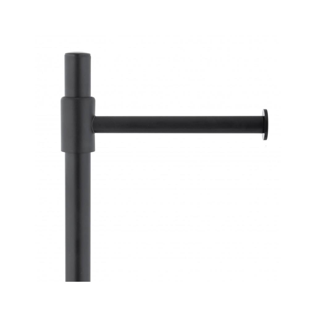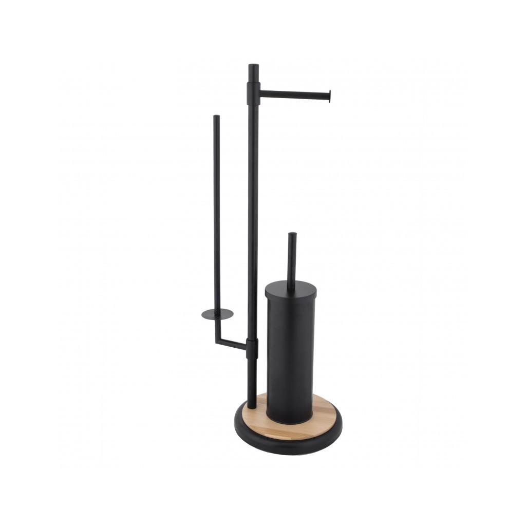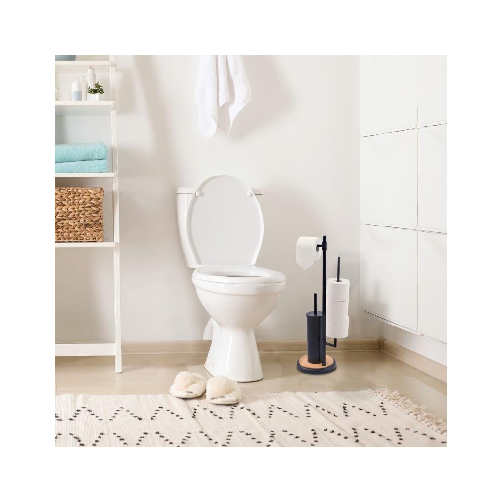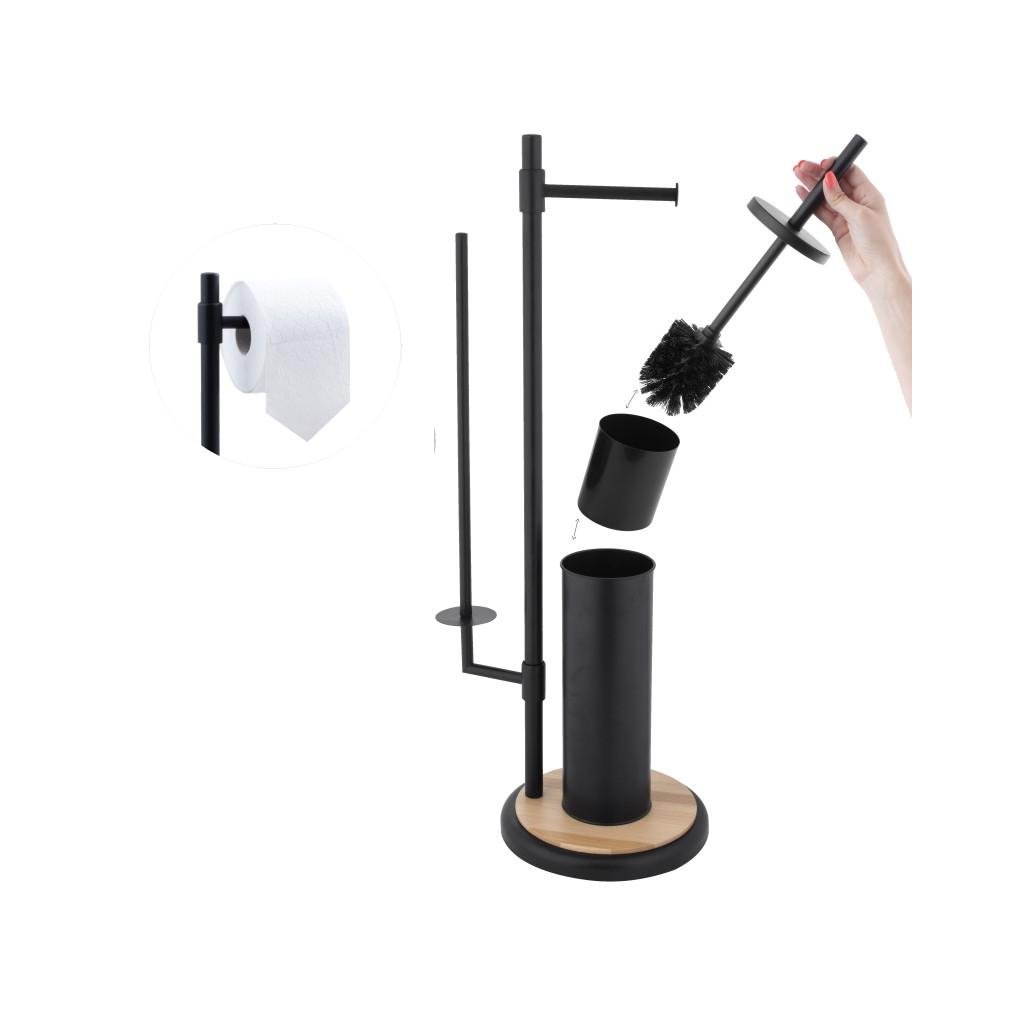 Elegáns állvány tartalék WC-papír tárolására extra WC-kefével és tekercstartóval. Az állvány kiváló minőségű festett acélból készült és természetes fa elemekkel - bambusz - van bevonva. A széles alap és a műanyag párnák kiváló stabilitást biztosítanak. Az állvány tökéletesen illeszkedik a loft stílusú fürdőszobába, valamint modern, ipari vagy klasszikus stílusba.