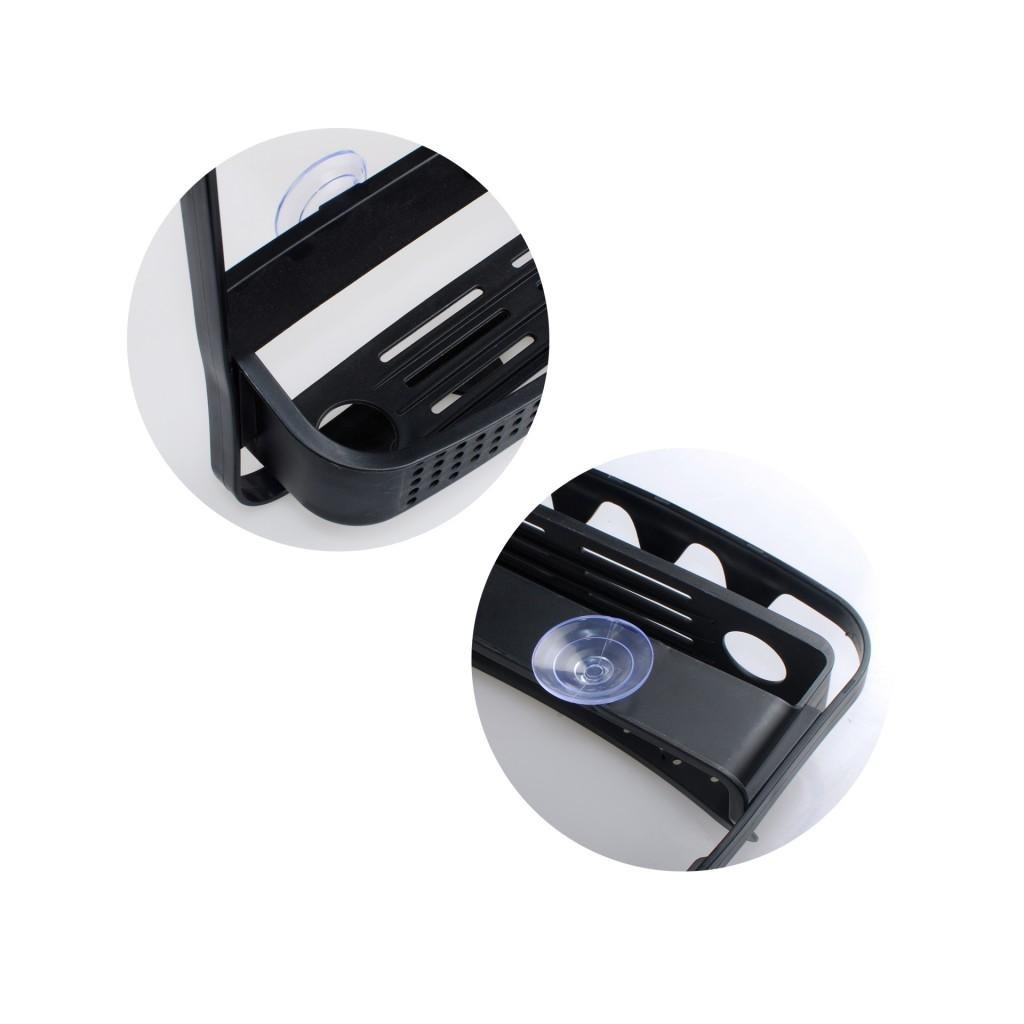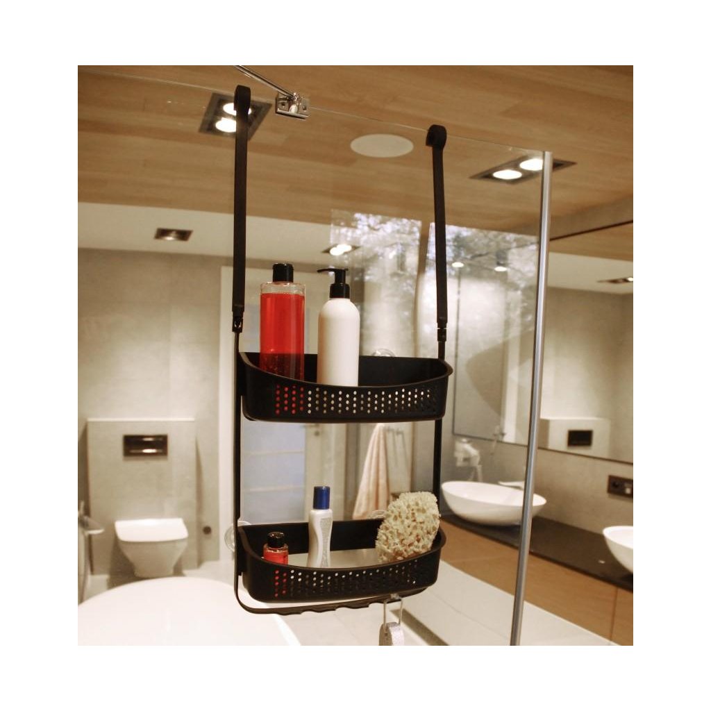 Fekete zuhanypolc, amely sok helyet takarít meg. Két profilozott műanyag kosárral és négy kampóval rendelkezik, amelyek jelentősen növelik a képességeit. A polcok lyukakkal vannak ellátva, amelyek biztosítják a víz szabad csepegését. A rugalmas gumipántoknak köszönhetően a rendező az esőzuhany karjára vagy a kabinajtó felső szélére akasztható. A rendszerező 4 tapadókoronggal rendelkezik, hogy stabilan tartsa, és nem billeg egyik oldalról a másikra, ha üvegre vagy csempére rögzítik. A tapadókorongok könnyen eltávolíthatók. Tökéletesen elfér benne minden szükséges fürdőszobai kiegészítő. Olyan emberek számára készült, akik értékelik a szilárd kidolgozást és a praktikumságot.