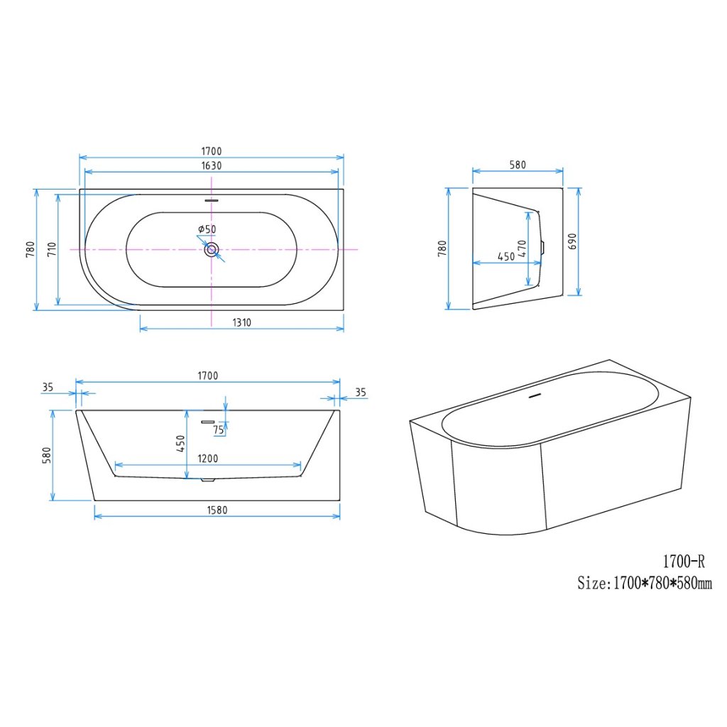 Erga Zara, sarok szabadon álló kád 170x78 cm + leeresztő csavar, jobb, fehér fényes, ERG-Zara-170078R-WH-WH
