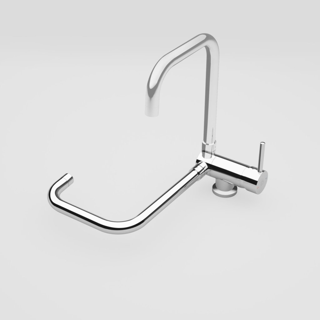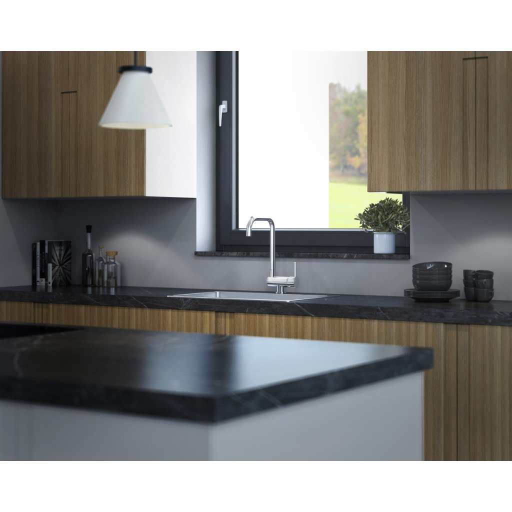 Az csaptelep az ablak alatt elhelyezett mosogatókhoz készült. Jellegzetes vékony fogantyúja és hosszú, hajlított kifolyója van. A kifolyó forgatható, ami kényelmet biztosít számunkra a mosogatás során és megkönnyíti az edények vízzel való feltöltését. Könnyen össze is hajthatjuk, aminek köszönhetően kényelmesen nyithatjuk és zárhatjuk az ablakot. Figyelemre méltó az csaptelep modern kialakítása is, amelyet a gyönyörű króm bevonat hangsúlyozott.