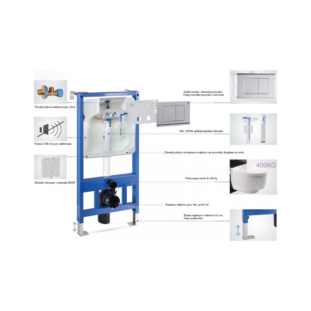 Többé nem kell minden egyes WC elemet külön kiválasztania - üzletünkben komplett készletet vásárolhat - kínálunk például a Mexen készletet, amely Fenix Slim keretből, LENA Perem nélküli szegély nélküli WC csészéből áll a könnyű karbantartás érdekében, ill. baktériumok és lassan leeső hőre lágyuló WC-ülőke ellen. A fenti készlet vékony deszkával (slim) volt felszerelve - ez a fajta deszka kényelmes és könnyen tisztítható (könnyen eltávolítható), és nem reped meg indításkor. A készlet a tálon és a lassan záródó lemezen kívül egy univerzális keretet is tartalmaz, amely tömör falra szerelhető vagy gipszkartonba építhető. A keret kiegészíthető a Fenix sorozat gombjaival.
