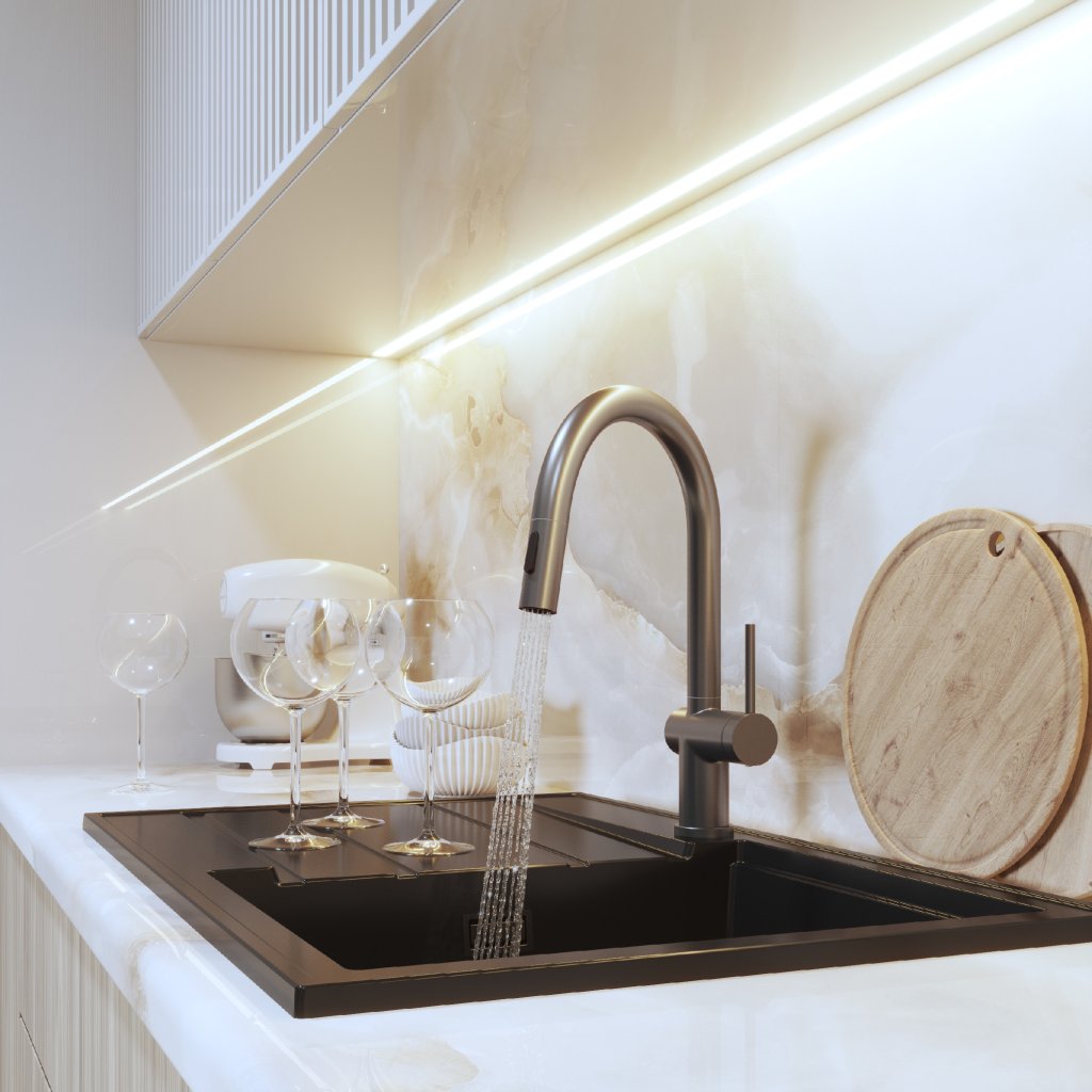 A modern ANA konyhai csaptelep elegáns grafit felülettel rendelkezik, minimalista dizájnnal, amely letisztult és időtlen megjelenést kölcsönöz minden konyhának. Sima felületének és precíz kidolgozásának köszönhetően luxus hatású, ugyanakkor rendkívül praktikus a mindennapi használatra.