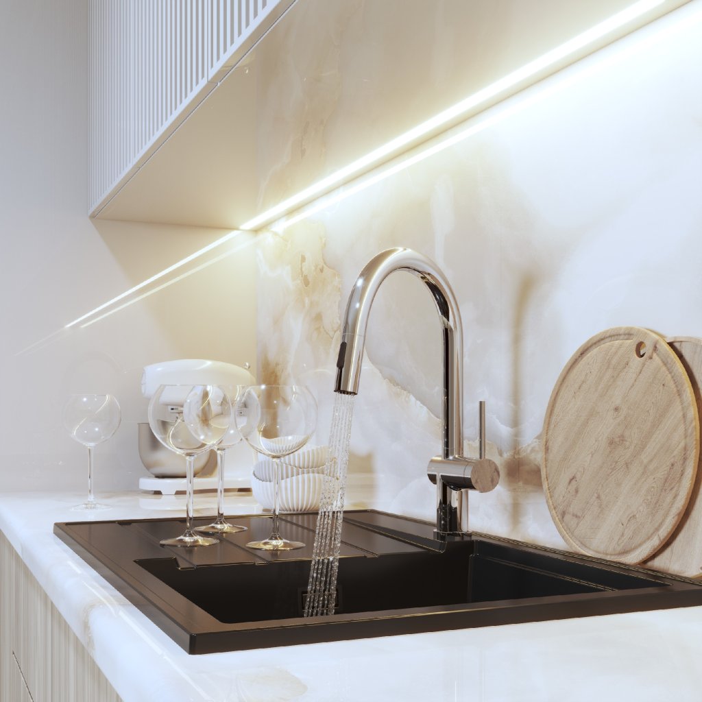 A modern ANA konyhai csaptelep elegáns króm felülettel rendelkezik, minimalista dizájnnal, amely letisztult és időtlen megjelenést kölcsönöz minden konyhának. Sima felületének és precíz kidolgozásának köszönhetően luxus hatású, ugyanakkor rendkívül praktikus a mindennapi használatra.