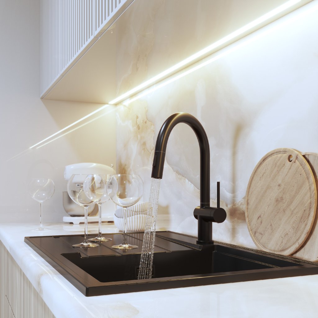 A modern ANA konyhai csaptelep elegáns matt fekete kivitelben, minimalista dizájnnal rendelkezik, amely letisztult és időtlen megjelenést kölcsönöz minden konyhának. Sima felületének és precíz kidolgozásának köszönhetően luxus hatású, ugyanakkor rendkívül praktikus a mindennapi használatra.