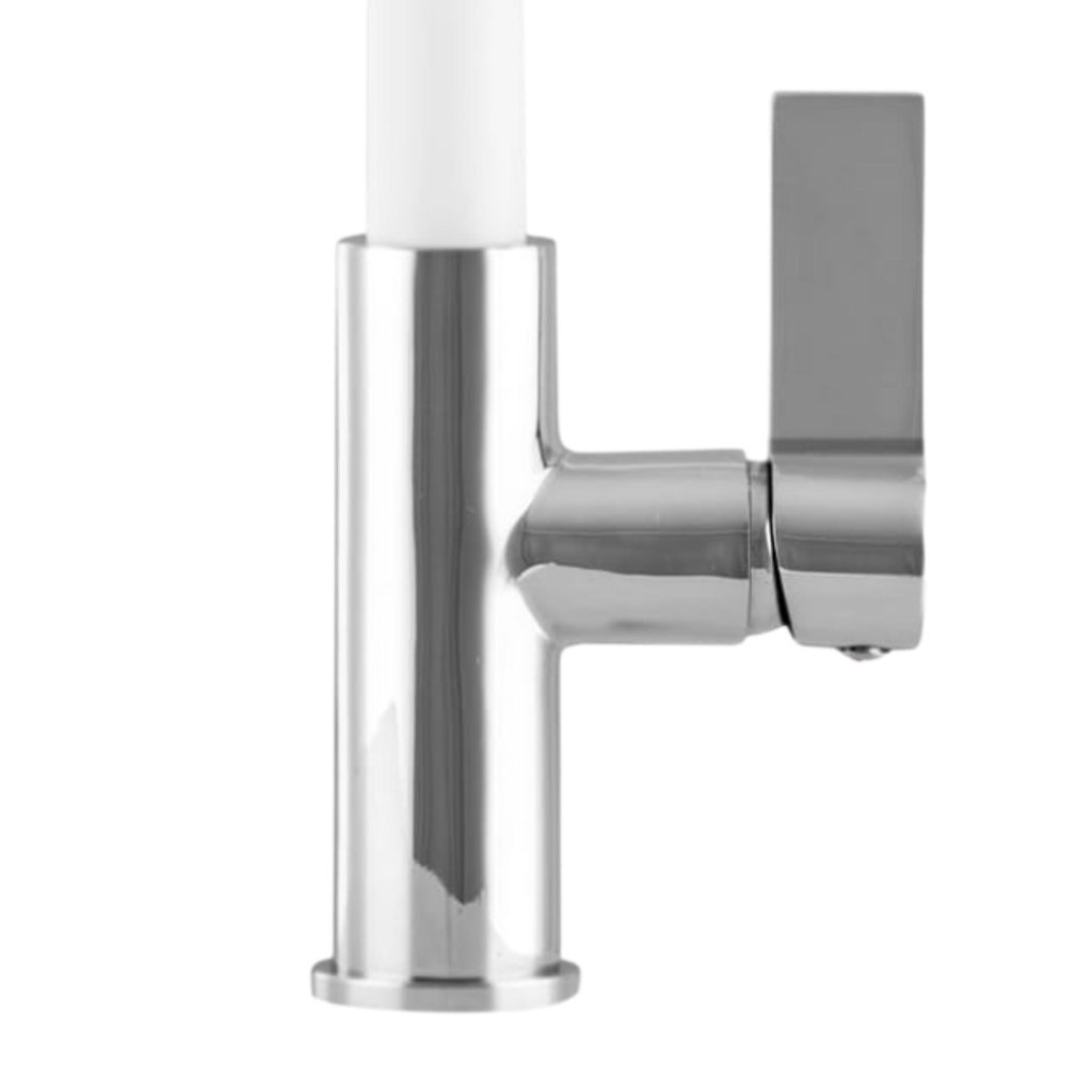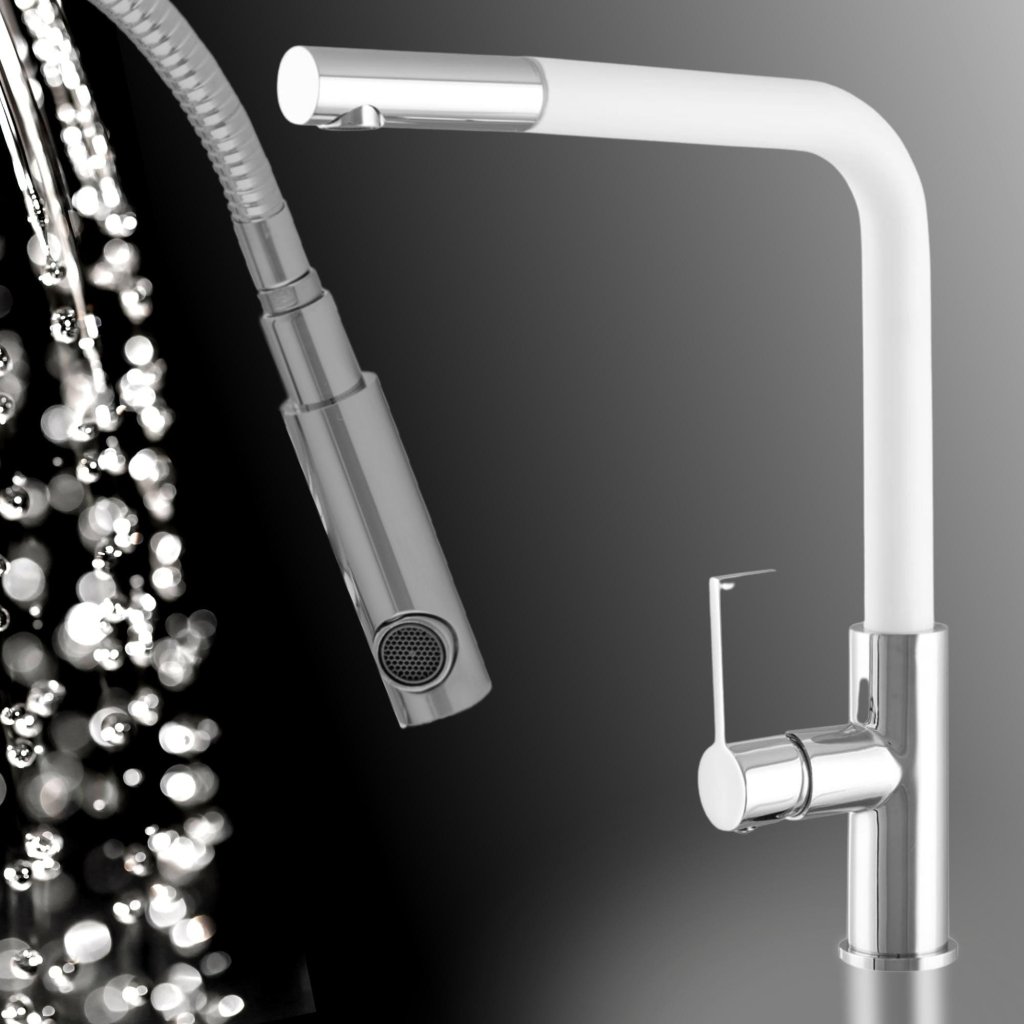 A színes kihúzható kifolyós konyhai csaptelep sok konyhába gyönyörűen illeszkedik. A krómozott sárgaréz test a fehér kifolyóval kombinálva modern és tartós megoldást teremt.