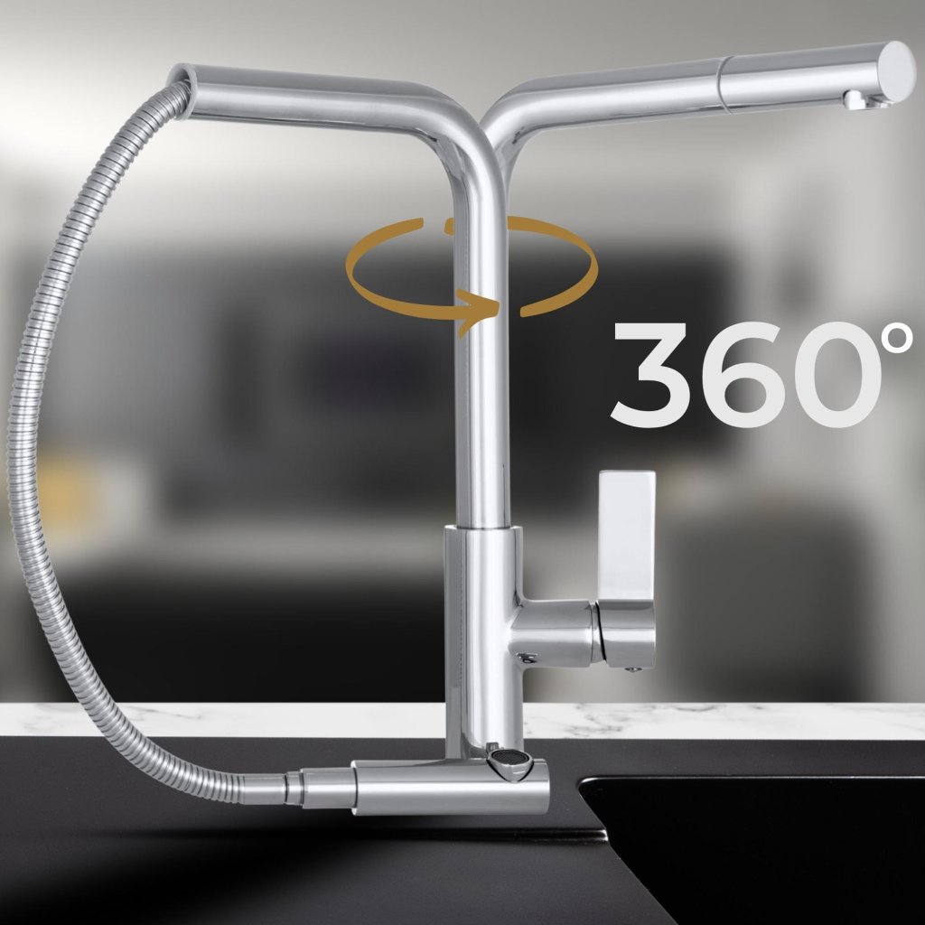 A 360°-os kifolyó kényelmesen és könnyen elfordítható bármely irányba. Ez megkönnyíti a nagyméretű edények elmosását és a mosogató teljes felületének öblítését, függetlenül a kamra mélységétől.