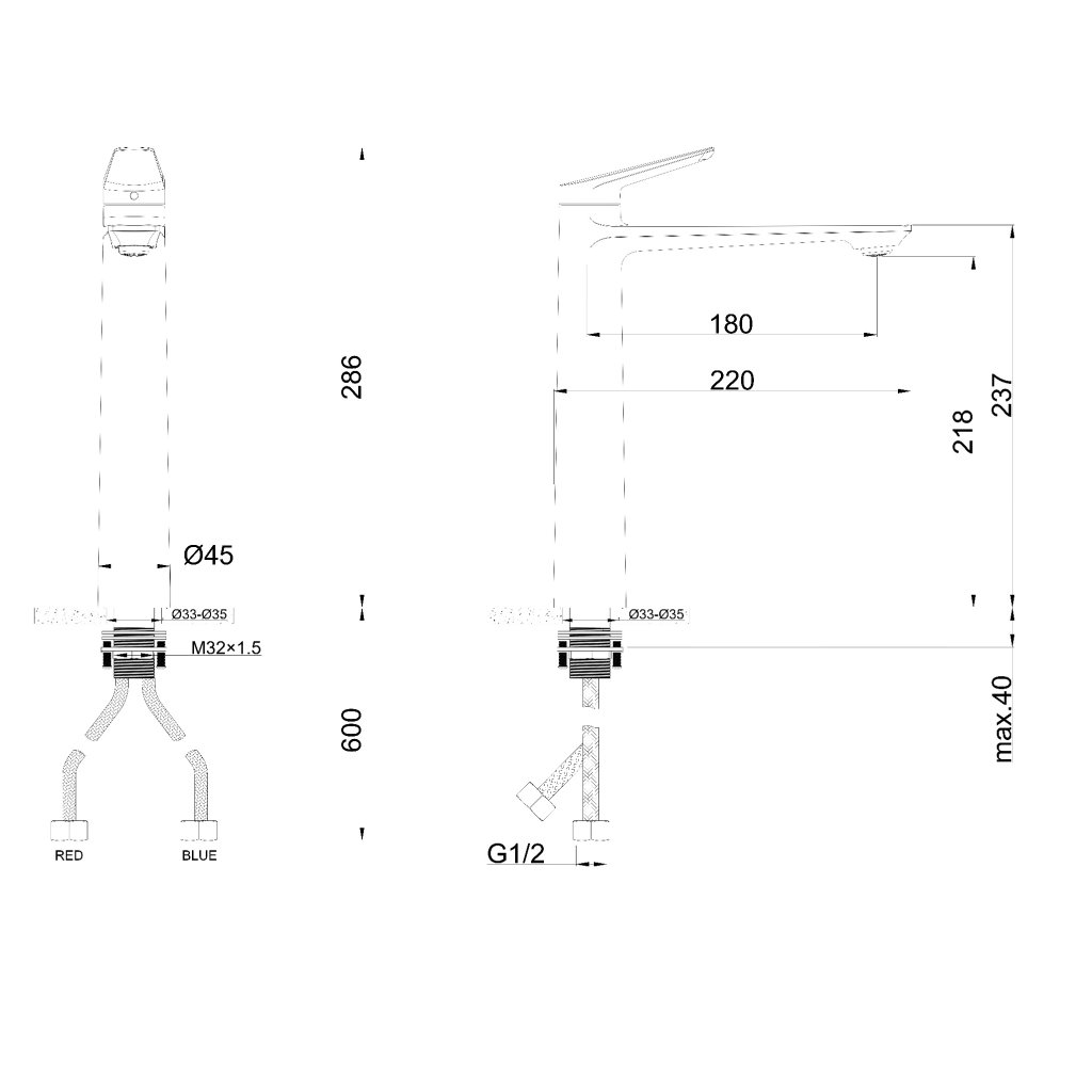 - Kifolyó tartomány: 180 mm