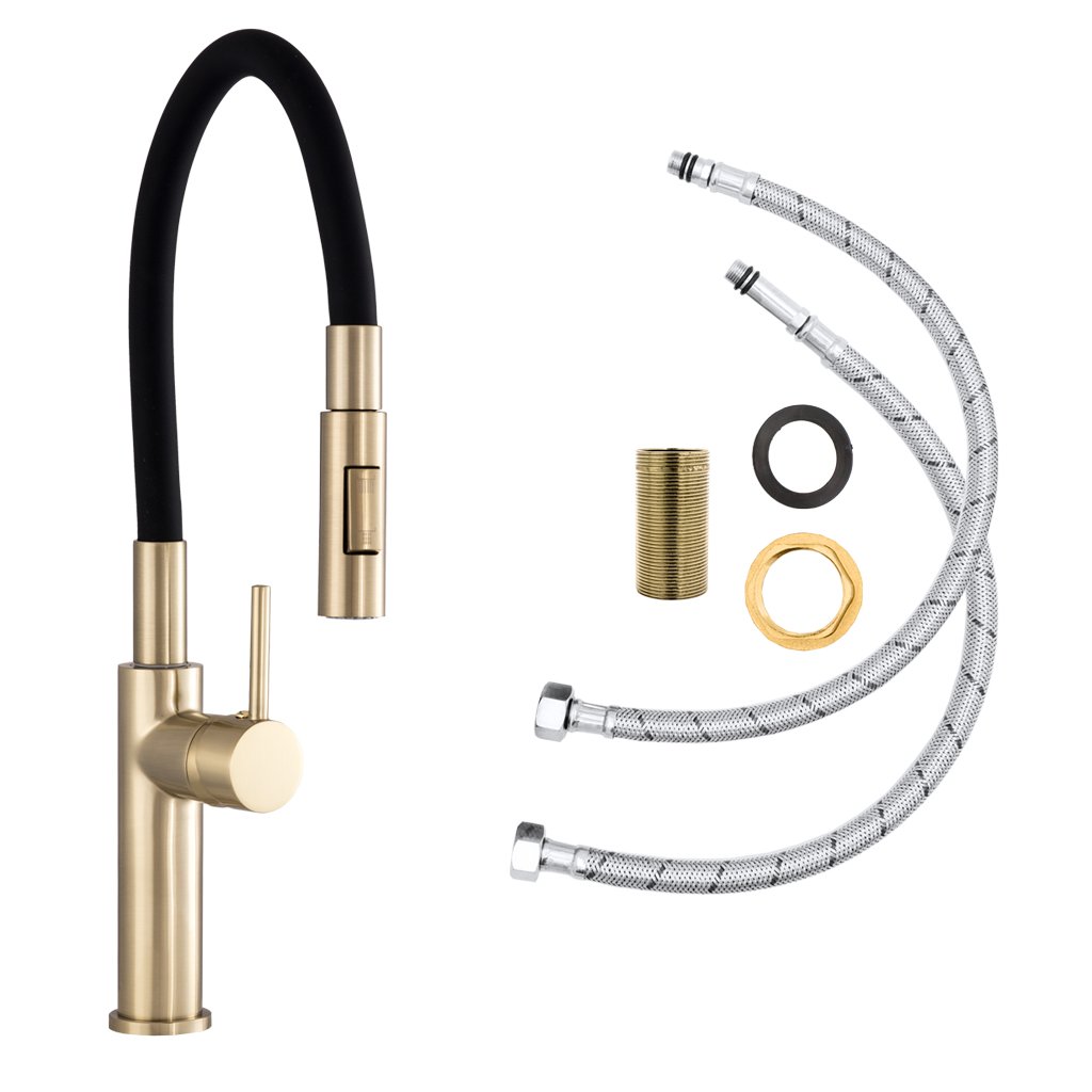 Gamma Full Új, magas konyhai csaptelep rugalmas karral és spray-vel, fekete-arany matt, GMA-BFLN-BGD