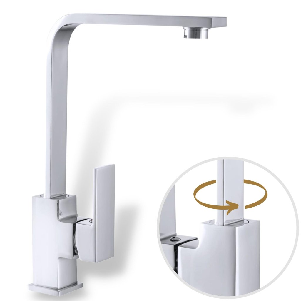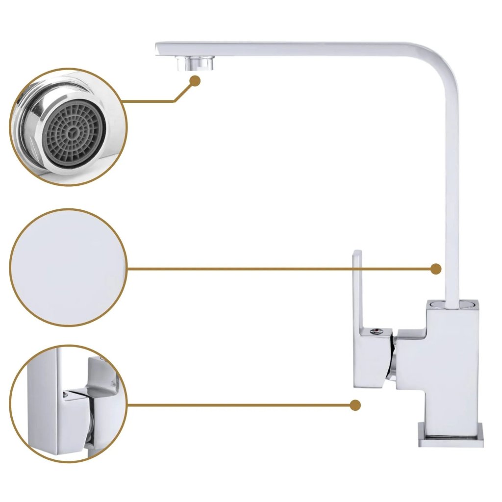 A dizájnos króm konyhai csaptelep tökéletesen passzol a gránit mosogatók színéhez. A tömör sárgaréz test szögletes kivitelben modern és tartós megoldást kínál egy stílusos konyhához.