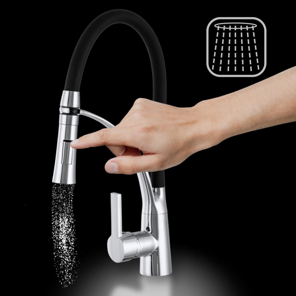 Gamma Nexo, szabadon álló magas konyhai csaptelep rugalmas karral és spray-vel, fekete matt-fényes króm, GMA-BNO-CH
