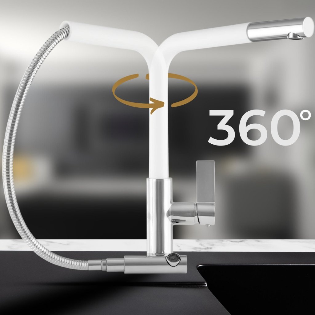 A színes kihúzható kifolyós konyhai csaptelep sok konyhába gyönyörűen illeszkedik. A krómozott sárgaréz test a fehér kifolyóval kombinálva modern és tartós megoldást teremt.