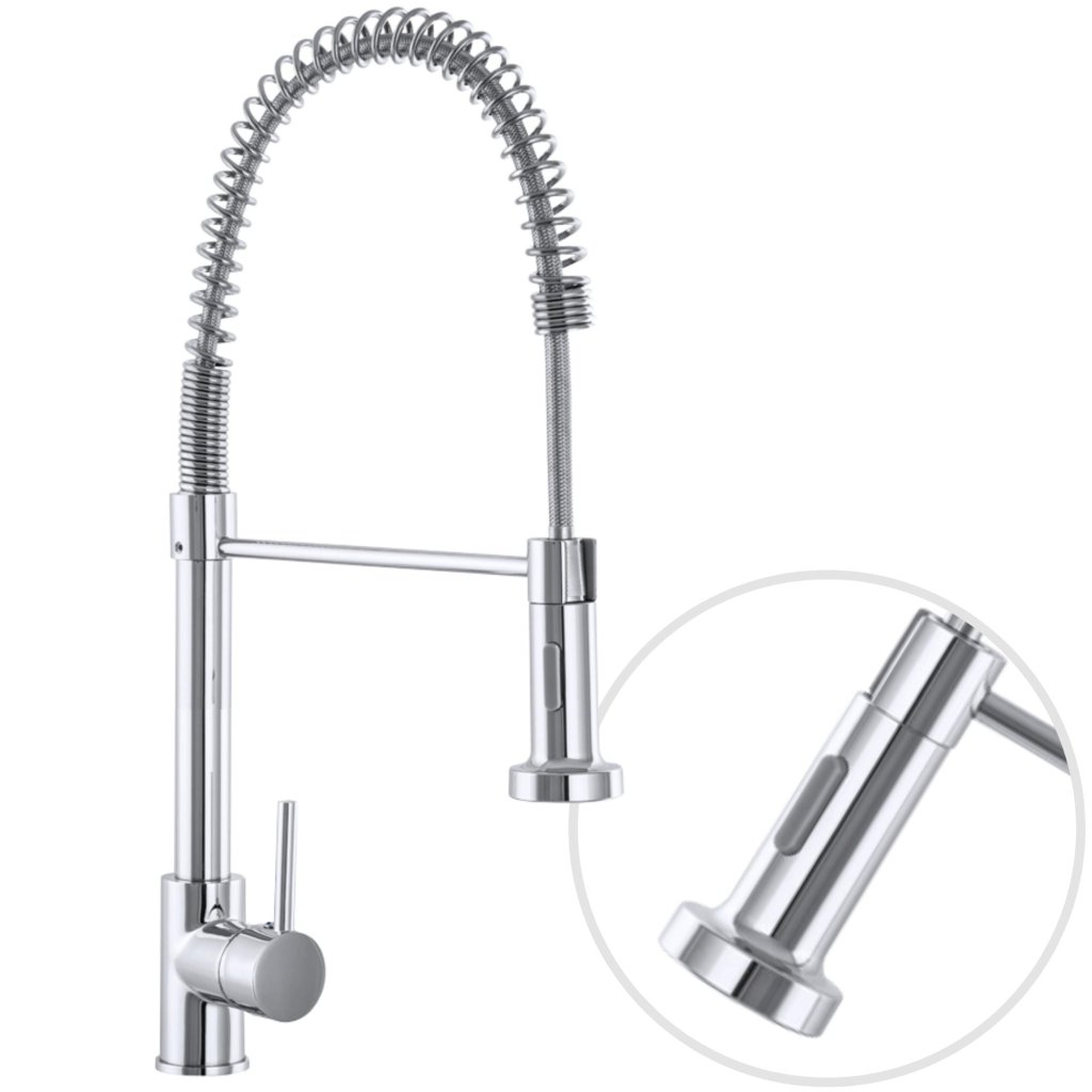 A konyhai csaptelep hosszú, rugalmas kifolyóval rendelkezik, fém tartóra szerelve. A spiráltömlő rugalmas kifolyója lehetővé teszi az akkumulátor hatótávolságának szabad beállítását.