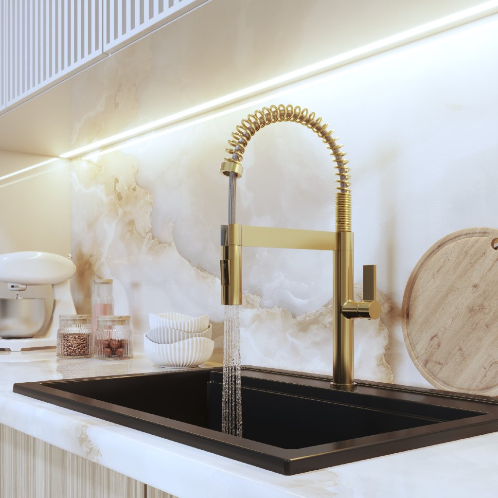 A modern és rendkívül funkcionális SPIRAL NEW konyhai csaptelep elegáns arany matt felülettel ideális választás bármilyen konyhába – otthoni vagy professzionális használatra. A jellegzetes spirális kialakítás dinamikus megjelenést kölcsönöz a csaptelepnek, és egyúttal növeli a praktikusságát a mindennapi használat során.