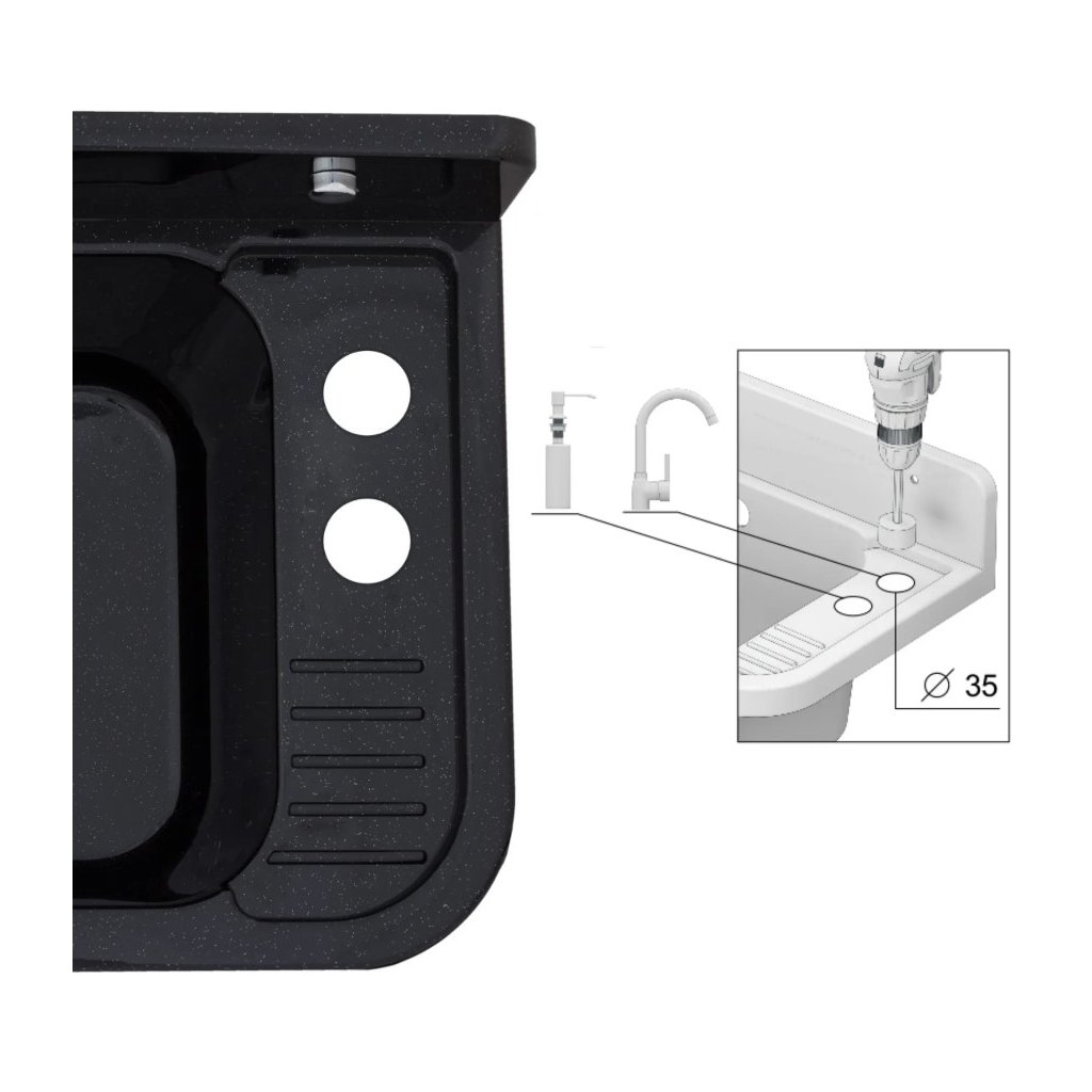 Az UNIVERSE mosogató kis csepegtetővel rendelkezik a jobb oldalon. Rengeteg hely van az akkumulátornak és a tartozékoknak - csak fúrja ki a lyukakat a megjelölt helyeken, és szerelje be az akkumulátort vagy az akkumulátort és a mosogatószer-adagolót a mosogatóba.