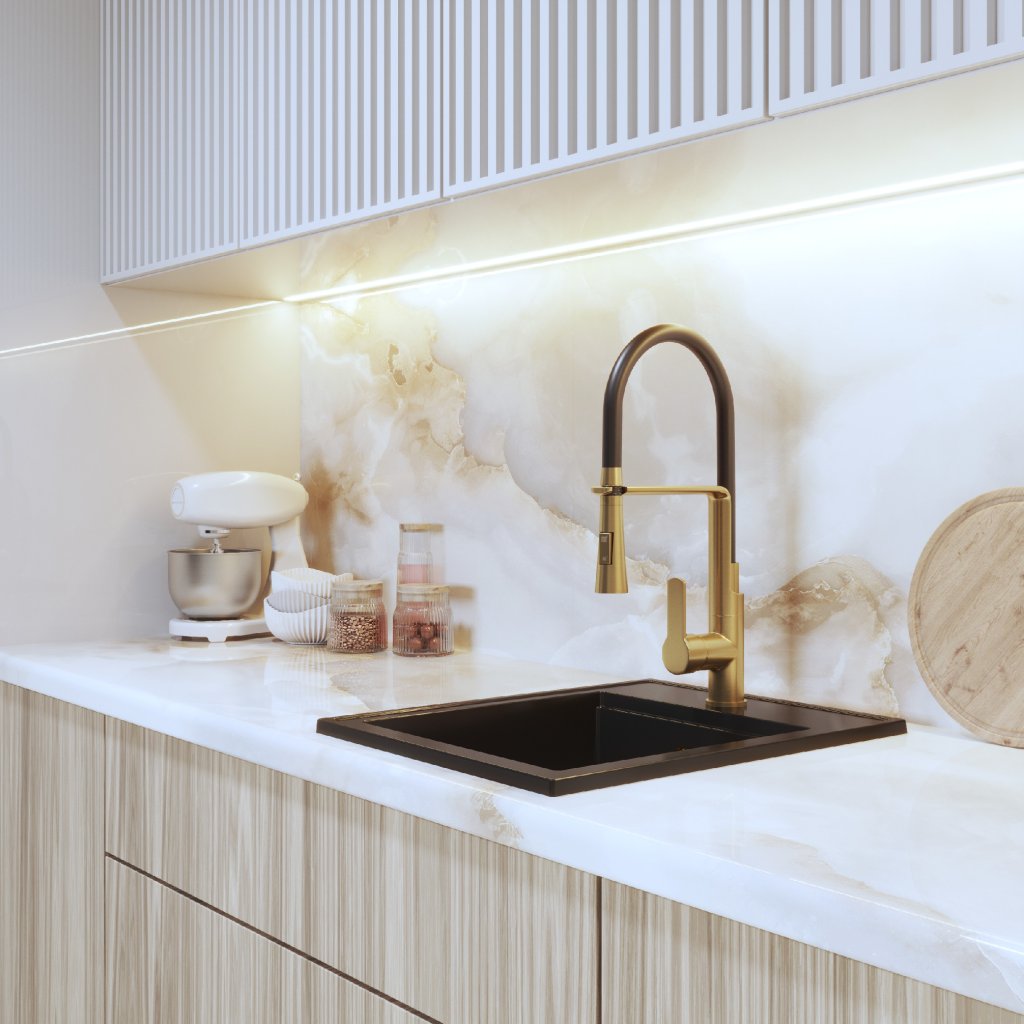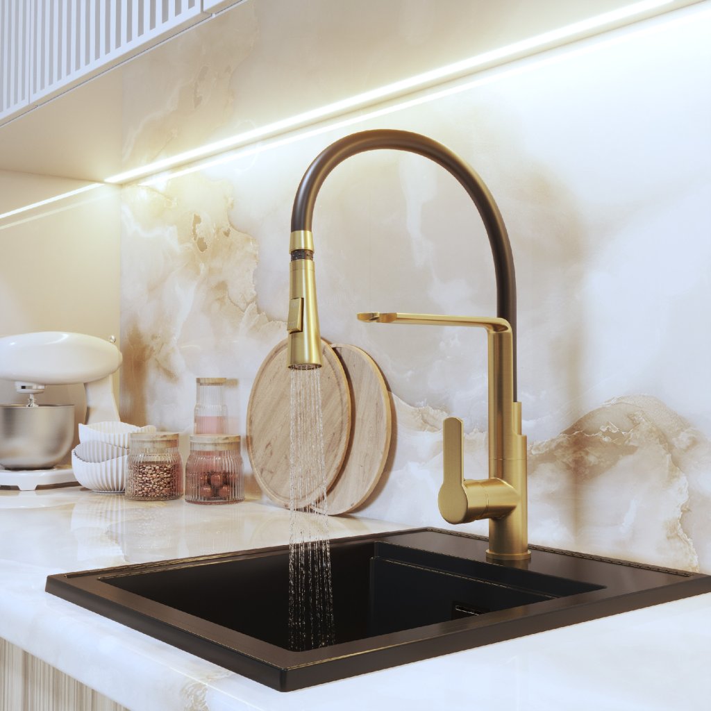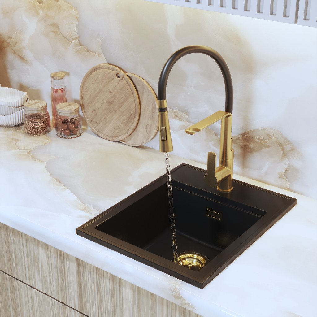 A magas és rugalmas konyhai csaptelep fekete és arany színben gyönyörűen illik egy modern konyhába.