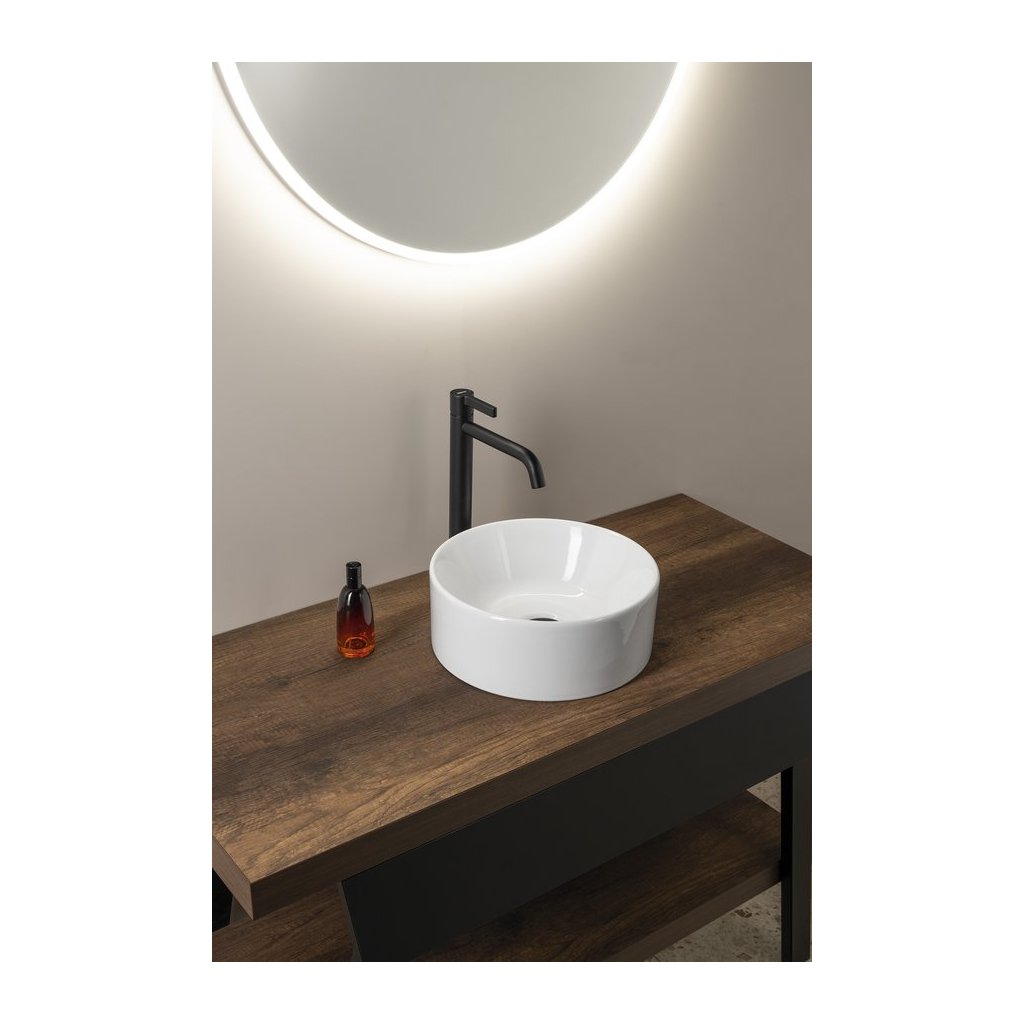 Sapho KUBE X sorozatú kerámia mosdópult, kör alakú kivitelben, 320 mm átmérővel. Kompakt méreteinek köszönhetően kisebb fürdőszobákban vagy kiegészítő mosdóként is használható.