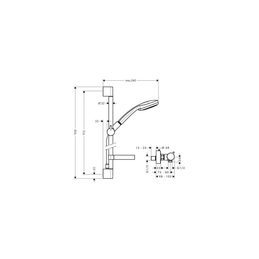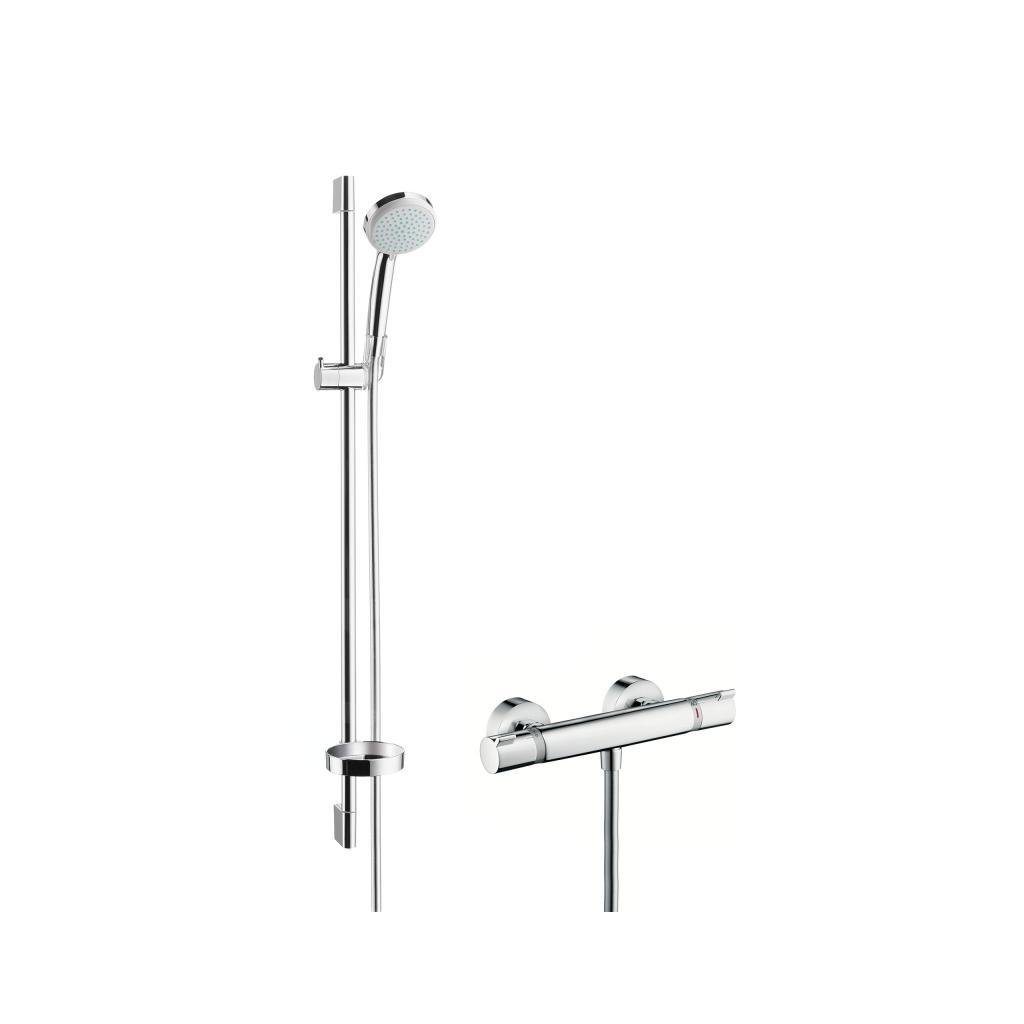 Az Ecostat Comfort termosztát fényes króm bevonattal van felszerelve. A szabadalmaztatott Hansgrohe patron két forgógombbal megbízhatóan garantálja a víz állandó térfogatát és hőmérsékletét. Így védelmet kap a kellemetlen ingadozások ellen. A 40 °C-os biztonsági biztosíték véd a túl forró víz ellen. A krómozott Unica'C fali rúd hossza 0,90 m. Az állítható magasságú csúszka lehetővé teszi a zuhany bármilyen magasságban és szögben történő rögzítését. A praktikus Casetta'C szappantartónak köszönhetően minden zuhanytartozék mindig kéznél lesz és a kívánt magasságban. Az Isiflex zuhanycső (1,60 m hosszú) nem gabalyodik össze vagy csavarodik.