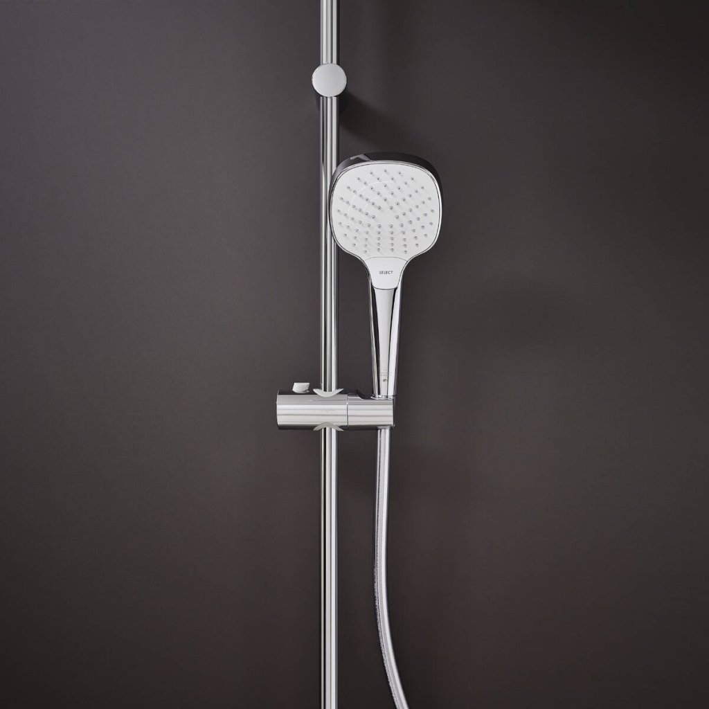 - A Kiválasztás gomb leegyszerűsíti a szokásos tevékenységeket a fürdőszobában. A gomb megnyomásakor a víz folyik vagy leáll. Zuhanyozáskor használja a gombot az áramlás típusának megváltoztatásához, vagy váltson fejzuhanyról kézizuhanyra