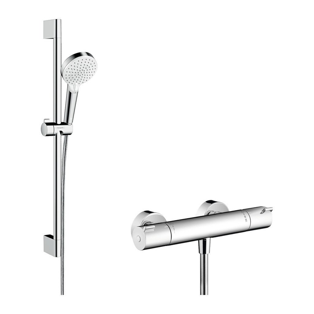 Hansgrohe Crometta, Vario falra szerelhető zuhanykészlet Ecostat 1001 CL termosztáttal és zuhanyrúddal 65 cm, fehér/króm, HAN-27812400