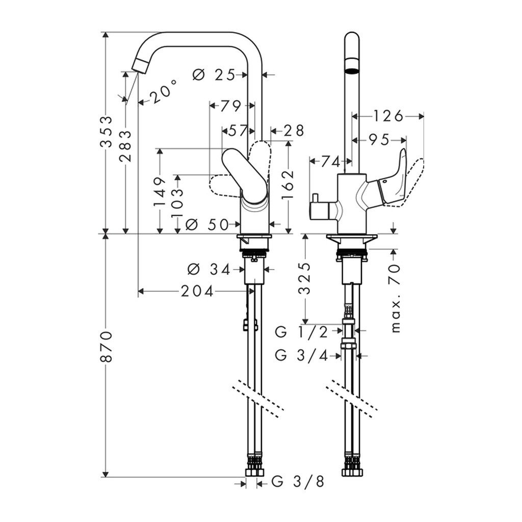 - Beépítési mód: G ⅜ tömlők csatlakoztatása