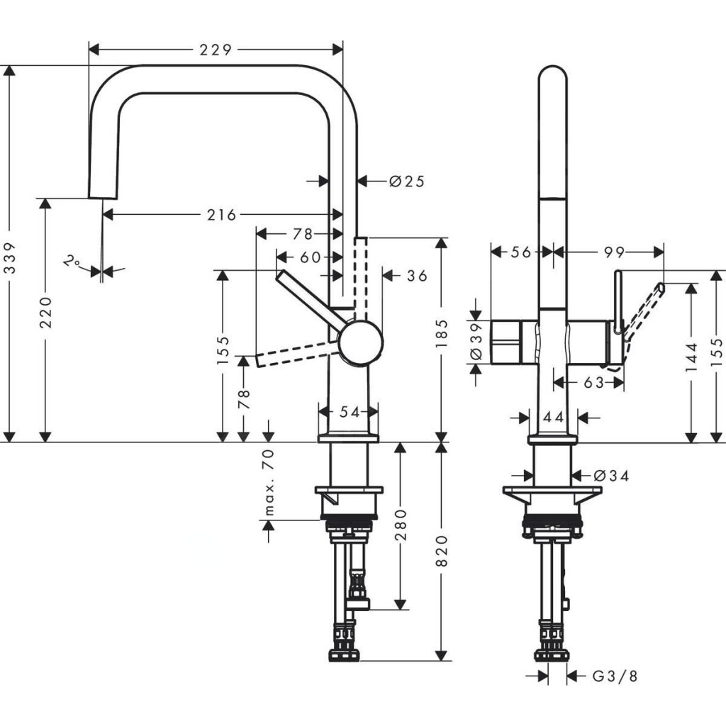 A Talis M54 220 típusú konyhai csaptelep 339 mm magas. Komfortzónája 220 mm. Ezért kényelmesen moshat poharakat egy magas száron alatta, és önthet vizet egy nagy edénybe és egy magas vázába. Egy perc alatt 8 liter víz folyik át ezen az akkumulátoron 3 bar nyomáson. Az akkumulátor kimenete négy tartományban forgatható - 60°, 110°, 150° vagy 360°.