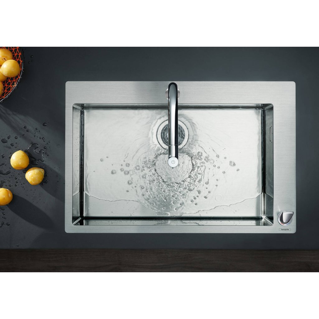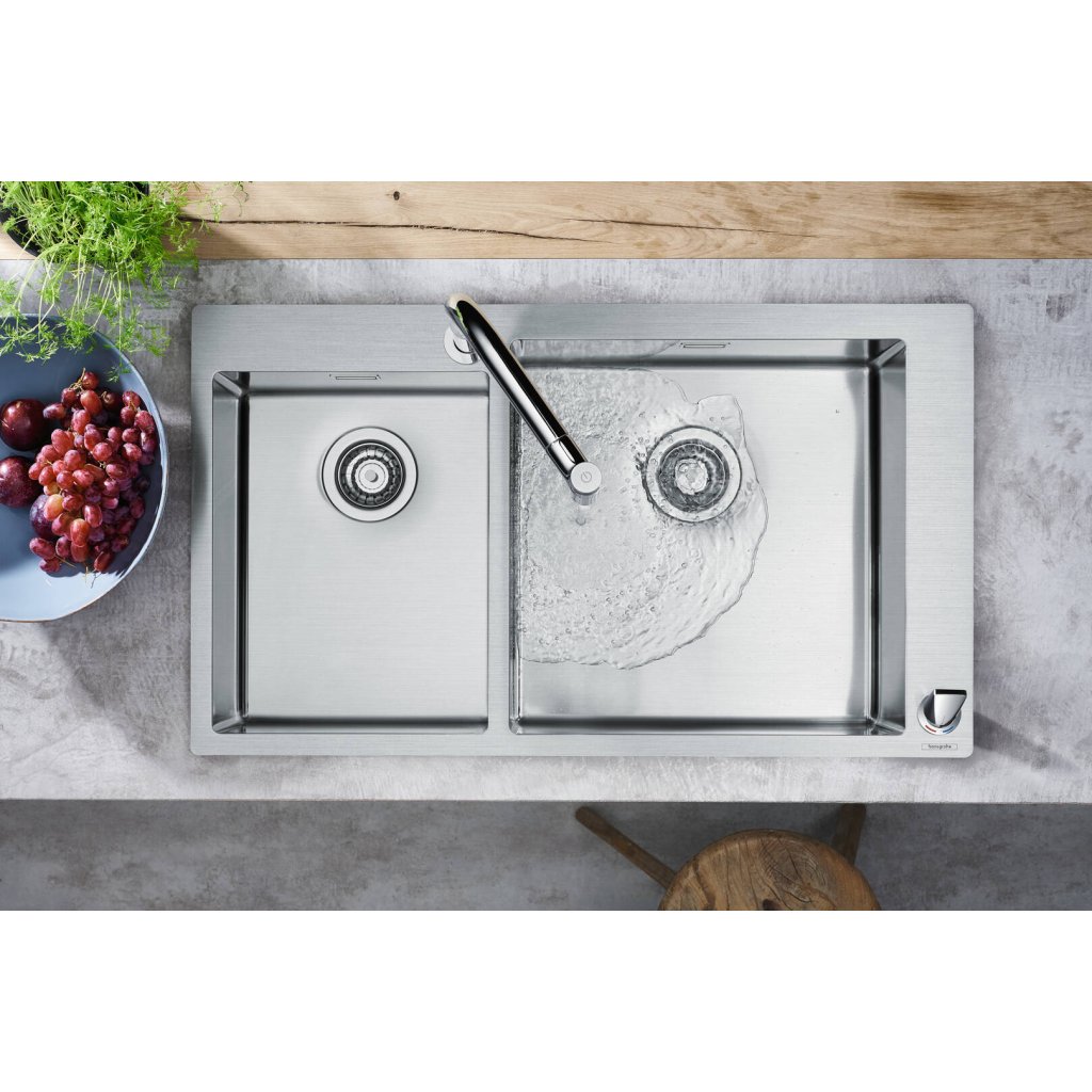 A gombnak köszönhetően A Select valamivel leegyszerűsíti a munkafolyamatot a konyhában. Kezdetben a csapot a fogantyú nyitja, majd egyetlen gombnyomással szüneteltethető és újraindítható a víz. Ha szükséges, kéz nélkül is vezérelheti az akkumulátort, mert a gomb intuitív módon a könyökével vagy a kézfejével kapcsolható, így az akkumulátor teljesen tiszta marad.