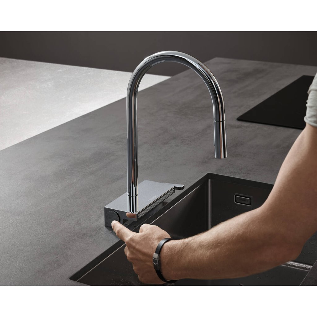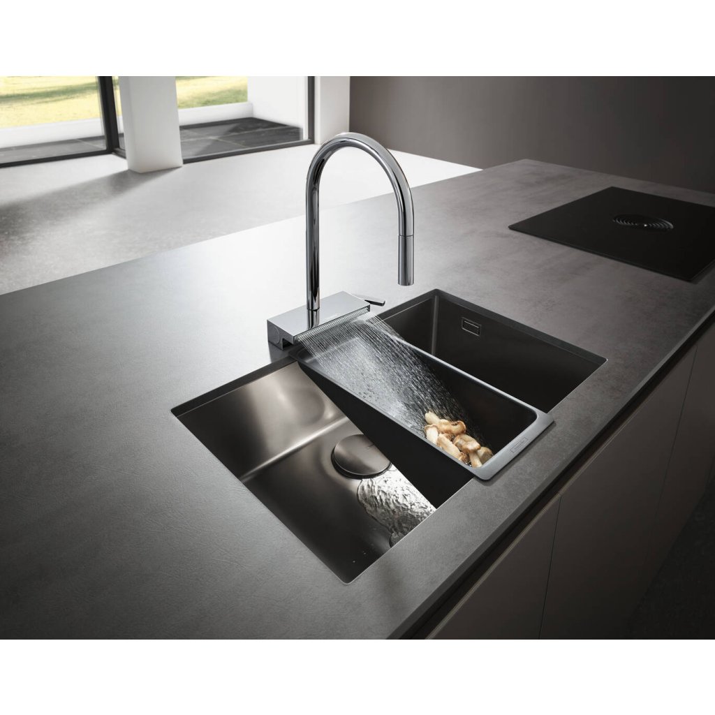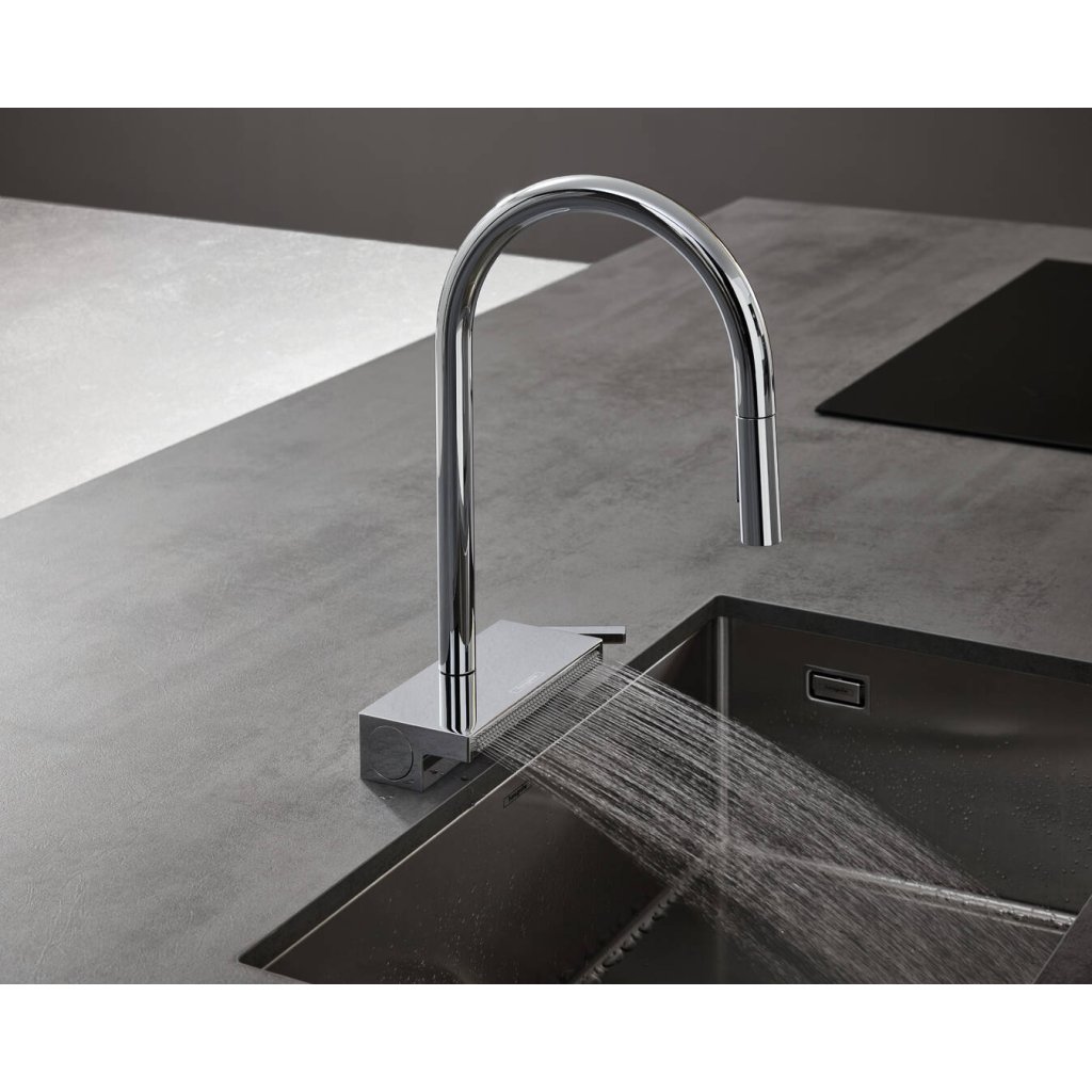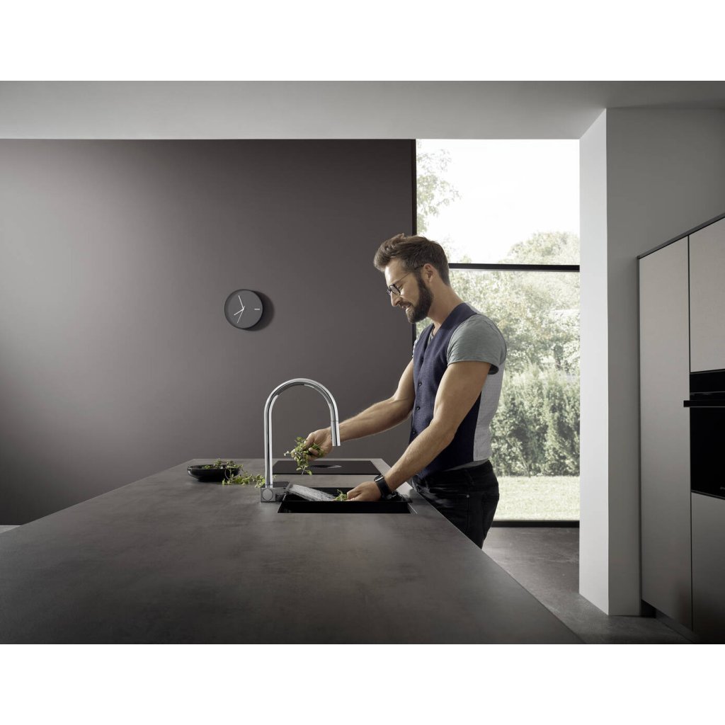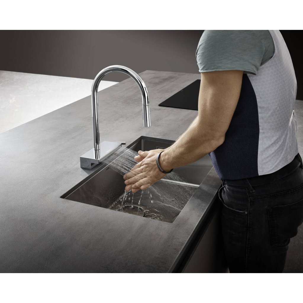 A hansgrohe Aquno Select mosogatócsaptelep úgy néz ki, mintha csak a távoli jövőből érkezett volna. Meg fog lepődni rendkívül időtlen dizájnjával és progresszív megjelenésével. Behúzható véggel és egyedi és lapos zuhanysugárral van felszerelve. Ez egy teljesen új típusú lamináris SatinFlow zuhanysugár, amely 133 különálló vékony vízsugárból áll. Finoman és hatékonyan veszik körül a törékeny alapanyagokat, és alaposan és kíméletesen mossák le.