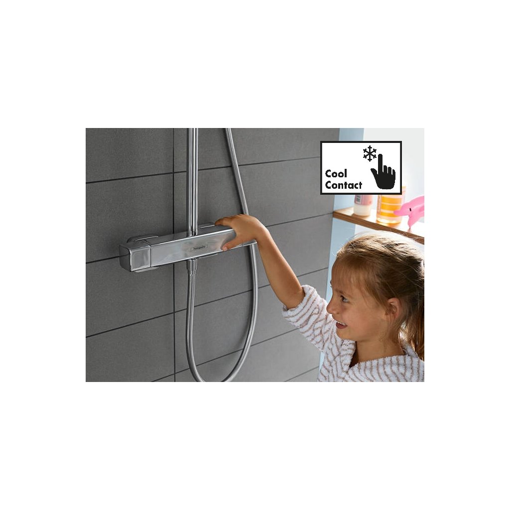 A technológia megakadályozza, hogy a termosztát felülete felmelegedjen, így még biztonságosabb a zuhanyozás. Az ezzel a hűtési technológiával felszerelt akkumulátorok mindig kellemes tapintásúak. A beáramló hideg víz a termosztát alaptestében van megvezetve úgy, hogy az közvetlenül a teljes elülső és felső fal mentén folyik. A fali csatlakozóról közvetlenül és kitérők nélkül vezetik a meleg vizet a patronba. A kevert víz hideg vízzel körülvéve kifolyik a patronból, jobbra a kifolyóhoz. És a hátsó és alsó falak mentén. Így a család minden tagja gond nélkül mozoghat a zuhanyzóban és a fürdőben.