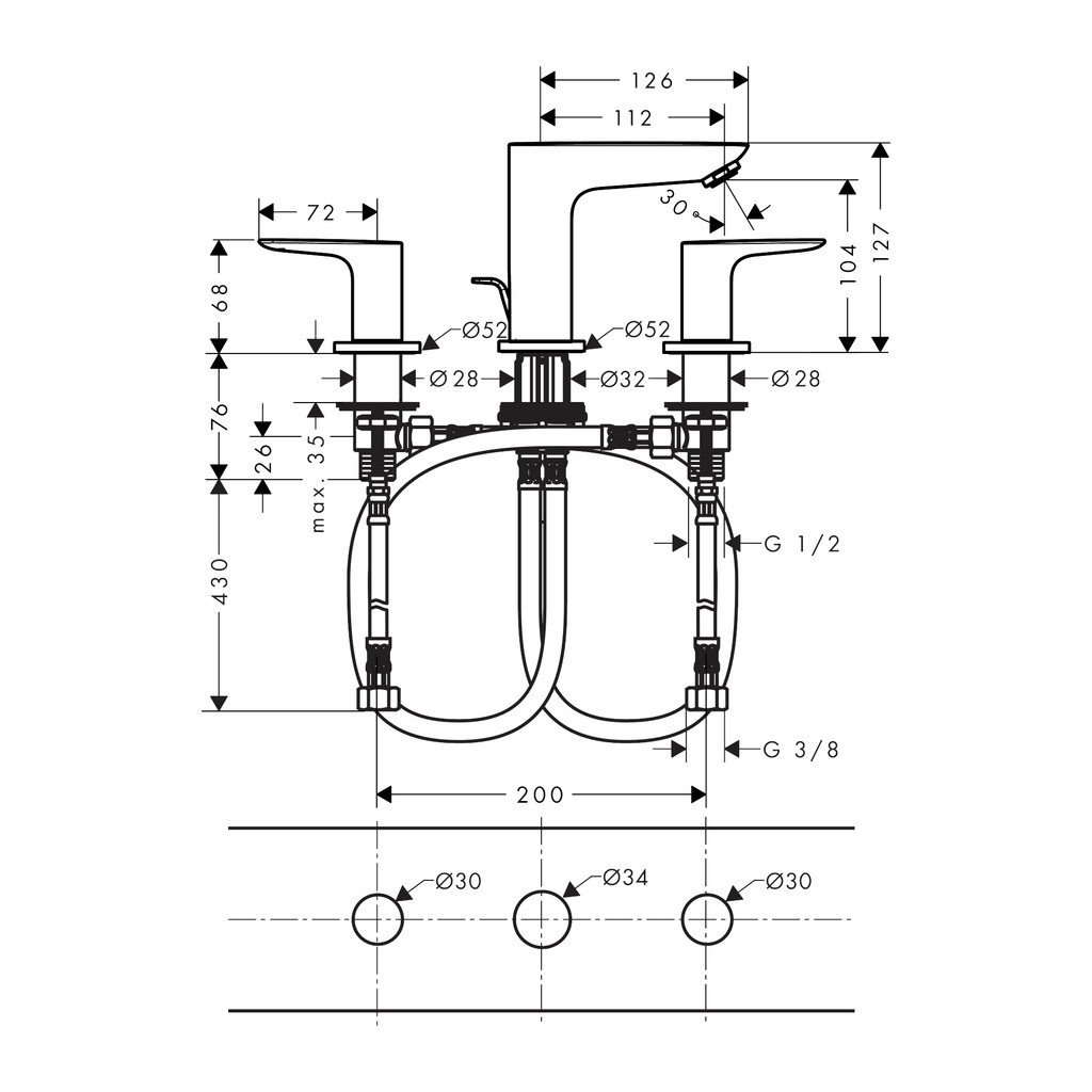- Típus: háromlyukú mosdócsaptelep húzós lefolyókészlettel