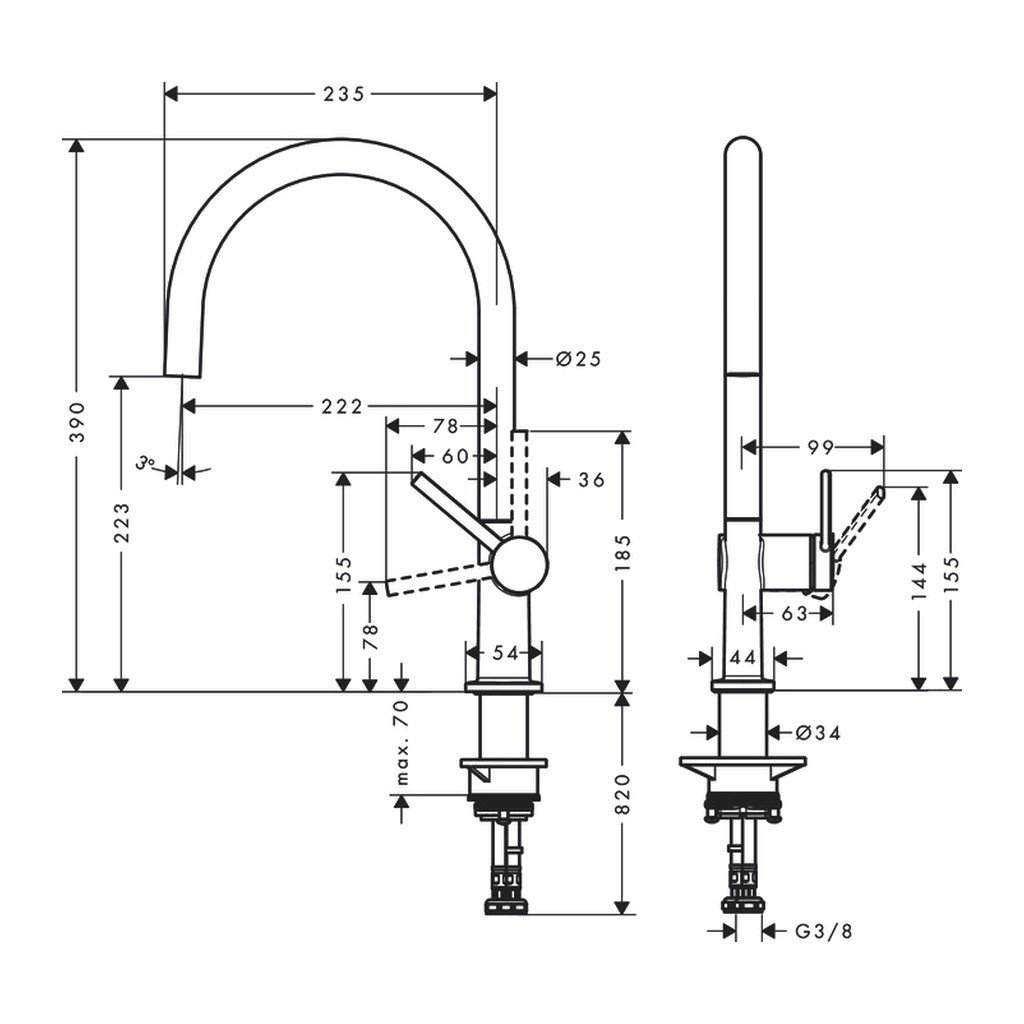 - Beépítési mód: G ⅜ tömlők csatlakoztatása