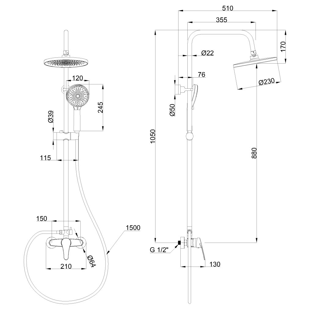 - Felső esőfej: Ø 23 cm, ABS, kerek, vízkőmentesítő rendszerrel