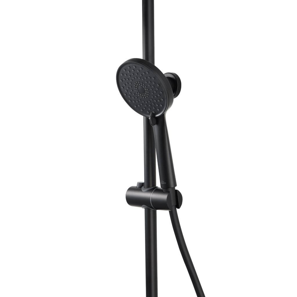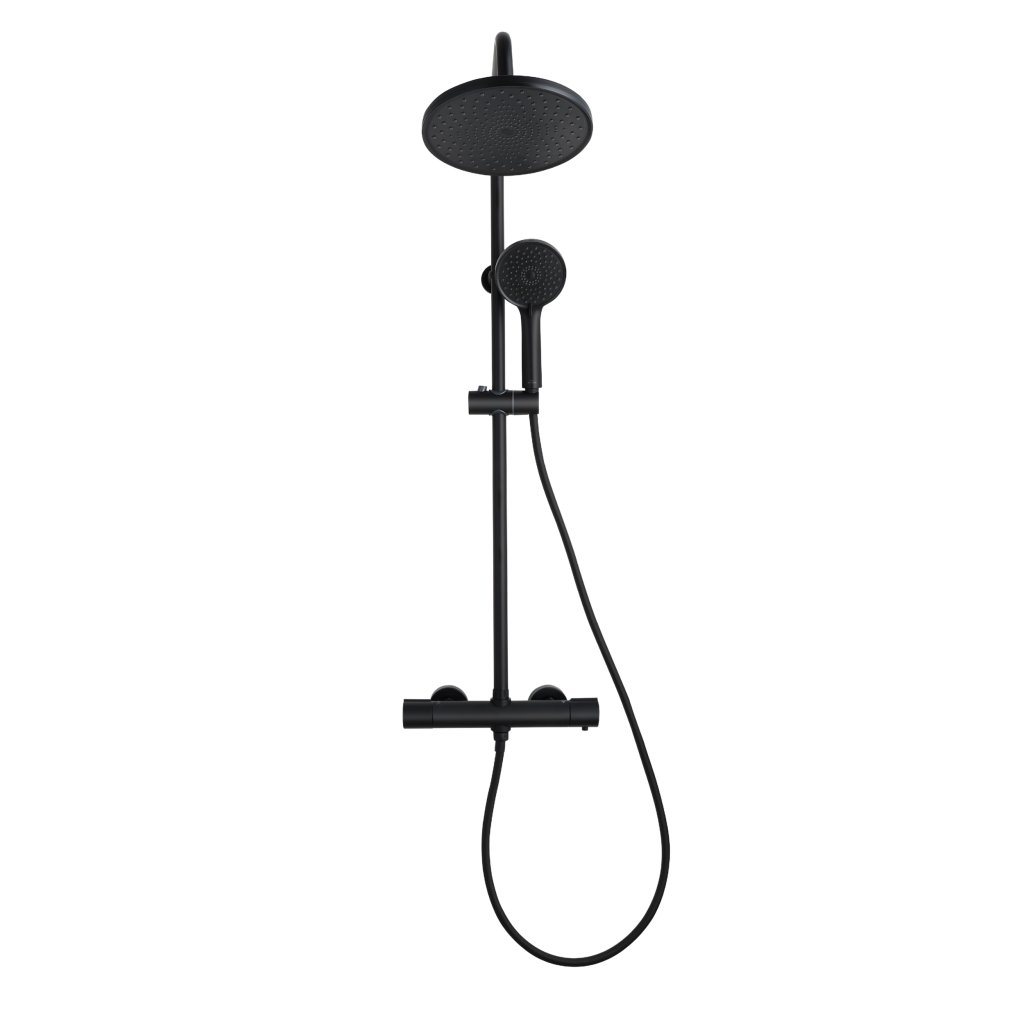 Ez a modell egy modern zuhanyszettet képvisel, amely oszlopos és termosztatikus keverőcsappal rendelkezik. Falra szerelhető, és a fürdőszoba kényelmét, biztonságát és esztétikáját hangsúlyozza. Fekete matt felülettel rendelkezik, amely stílusos kiegészítője lehet egy modern, minimalista vagy ipari stílusú fürdőszobának.