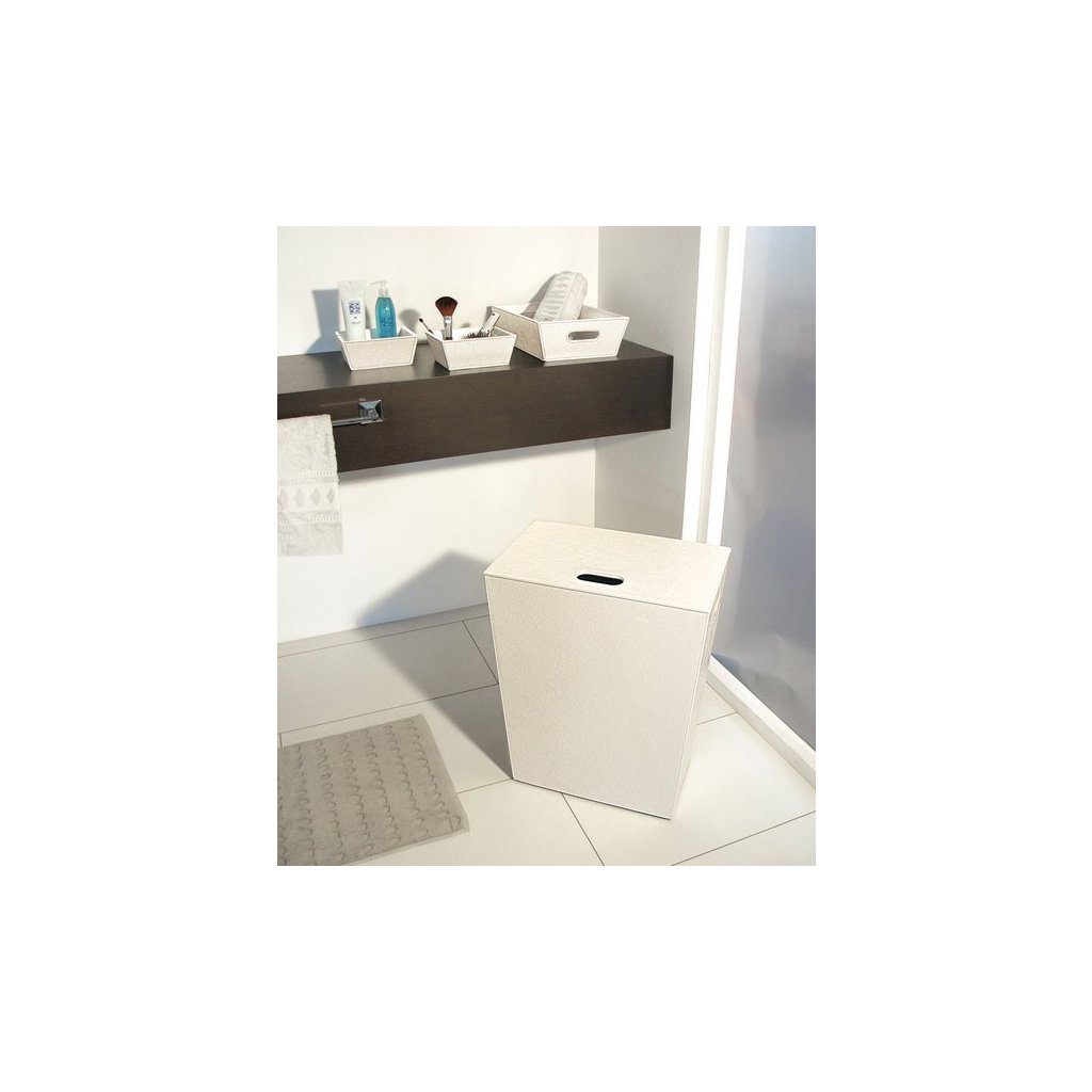 Stílusos fürdőszobai kiegészítők modern színekben, műbőrrel bevont fából. A tökéletes kidolgozást egy dekoratív varrat húzza alá. Az ECO PELLE szennyeskosár a fürdőszoba nélkülözhetetlen részévé válik.