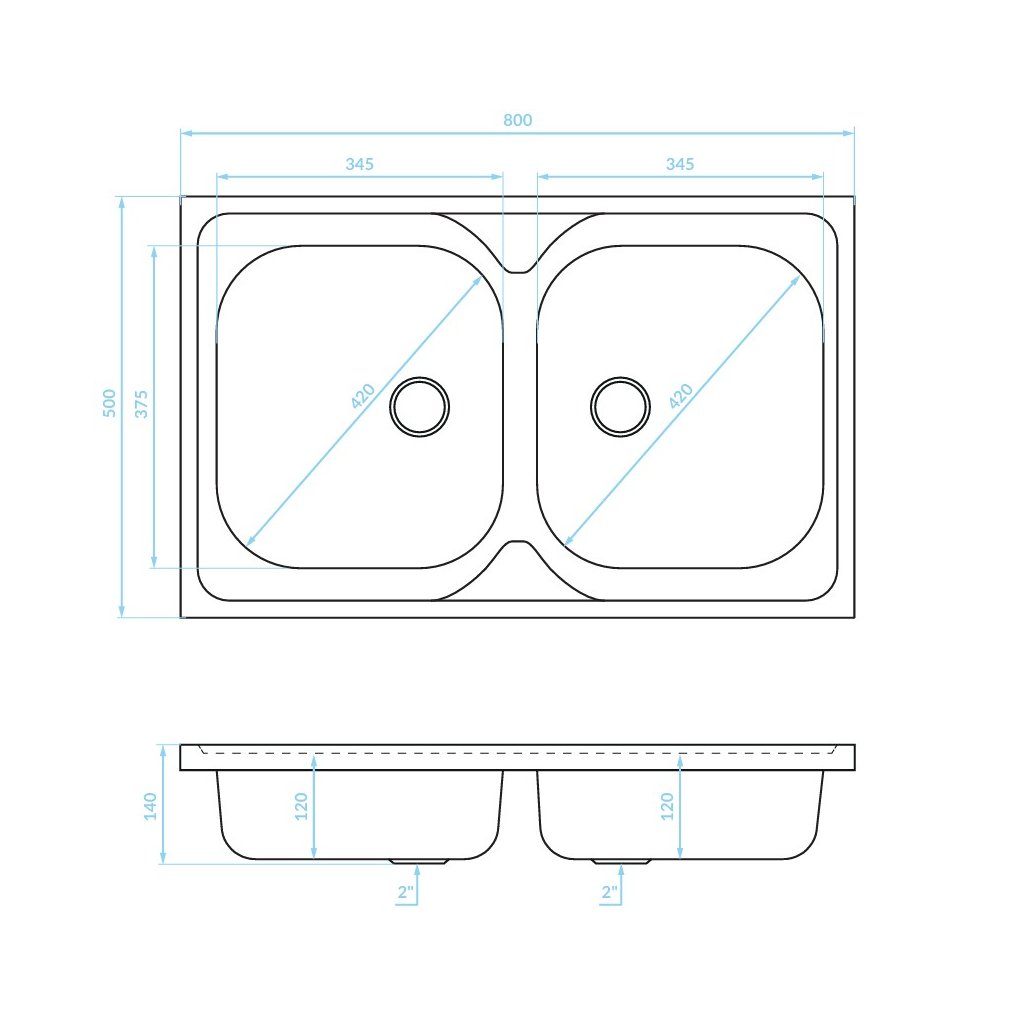 Kuchinox 50, 2 rekeszes rozsdamentes mosogató 800x500x140 mm szekrényburkolathoz, acél, LAV-SK5_020T