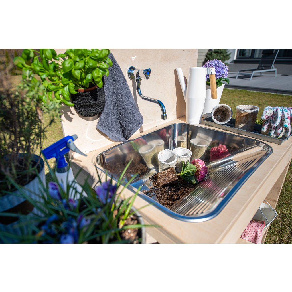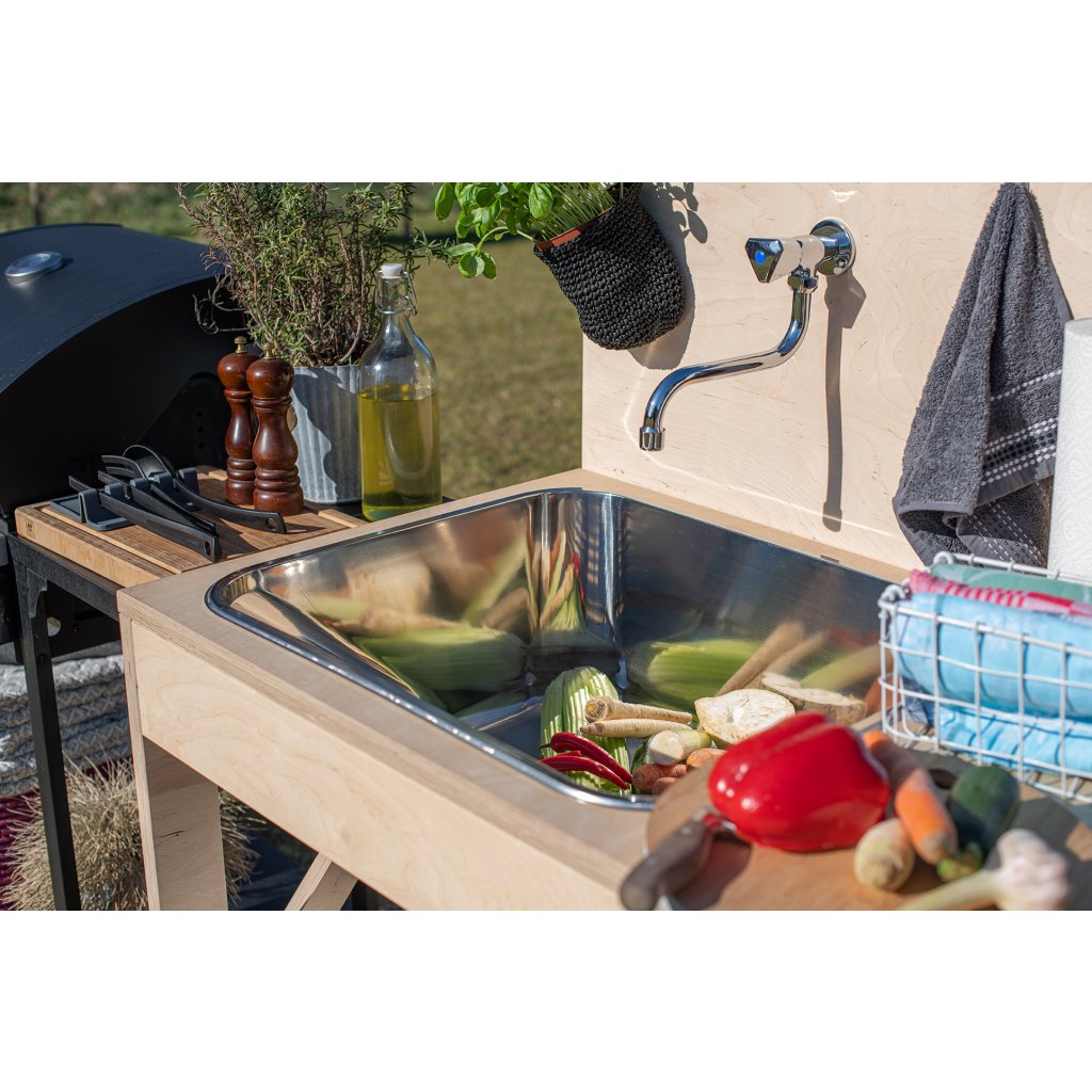 A Kuchinox Norm fali egykaros csaptelepe gyakran szerelhető háztartási helyiségekben vagy kertekben található mosogatókra. Hasznos lesz azoknak, akik gyakran dolgoznak a garázsban, vagy kültéri partikat szerveznek - lehetővé teszi a szerszámok vagy edények hatékony elmosását. Kerti növények öntözéséhez is használható. A csaptelep hosszú, mozgatható kifolyóval és egy gombbal van felszerelve.