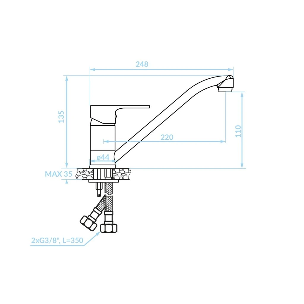 A krómozott felület modern megjelenést kölcsönöz a csaptelepnek, ugyanakkor könnyű karbantartást és korrózióállóságot biztosít. A csendes működés az I. akusztikus csoporttal garantálja a kényelmes használatot zavaró hangok nélkül. A 35 cm hosszú csatlakozótömlők elegendő helyet biztosítanak a mosogató alatti egyszerű beszereléshez.
