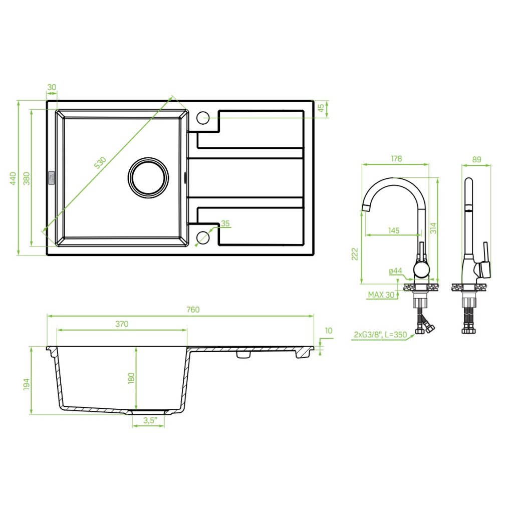 | Model: | Obdĺžnikový, 1-komorový vrátane drezovej batérie |