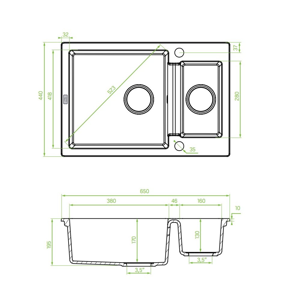 - Gyárilag fúrt furatok: Igen (2), 1 x konyhai csaptelephez és 1 x automata dugó vezérléshez