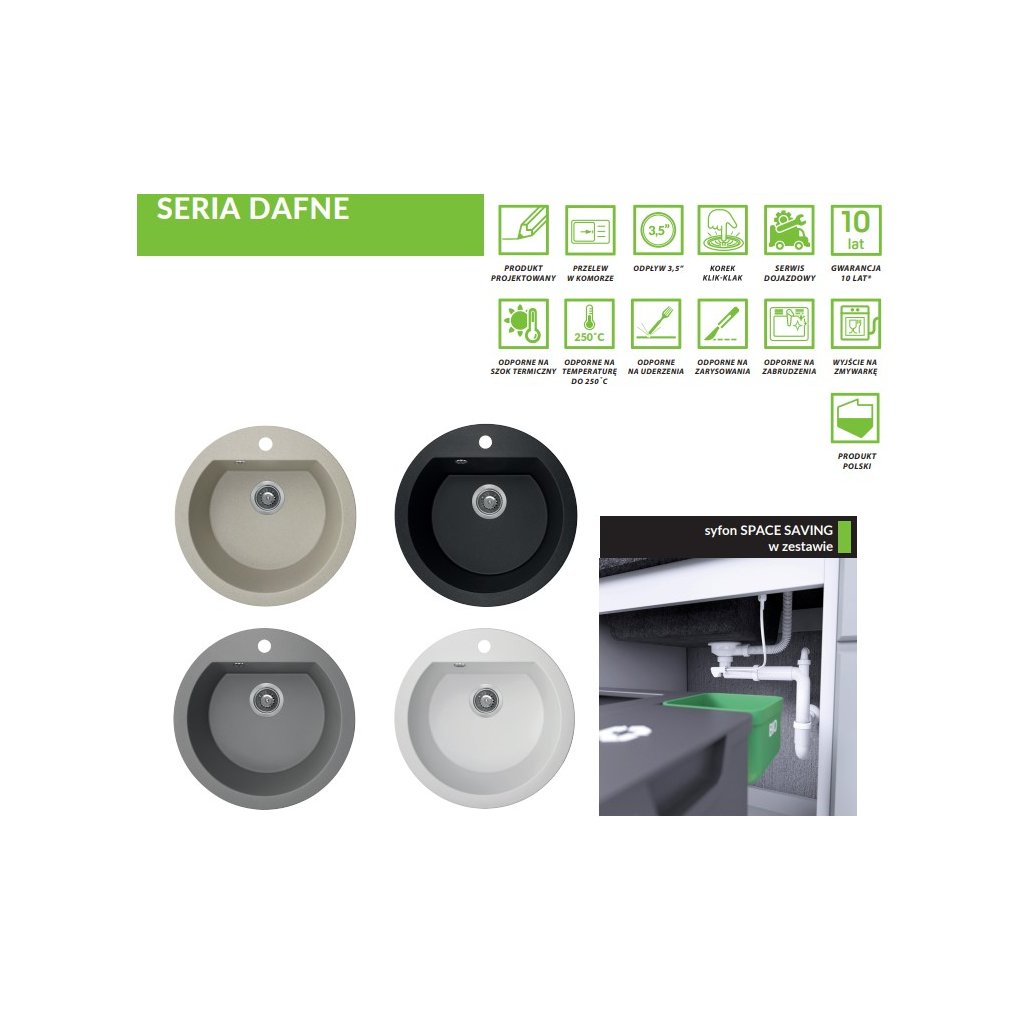 A Dafne egy Laveo mosogató kollekció nagy számú modellel. A sorozat a következő modelleket kínálja: csepegtető nélküli változatban az akkumulátor számára lyukkal és anélkül, csepegtetővel vagy fél csepegtetővel és dupla tállal csepegtető nélkül. Mindegyik rendelkezik mosogatógép csatlakozással és egy 3,5"-es szűrővel ellátott pattintható dugóval, amely megvédi a rendszert a konyhai eszközökből származó esetleges élelmiszer-szemcséktől való eltömődéstől. A helytakarékos szifon, ahogy már a neve is sugallja, helyet takaríthat meg a mosogató alatti szekrényben a szemetes edények vagy a tisztítószerek rendszerezője számára. A Dafne a klasszikus stílusú belsőépítészet szerelmeseinek választása. A mosogató finoman lekerekített szélei, természetes földszínek: fehér, fekete, bézs, szürke és meleg tapintású gránit mosogató optikailag "felmelegíti" a belső teret. A gránit termék ellenáll a hősokknak, magas hőmérsékletnek, ütéseknek és szennyeződéseknek. A gyártó 10 év garanciát vállal a termékre.