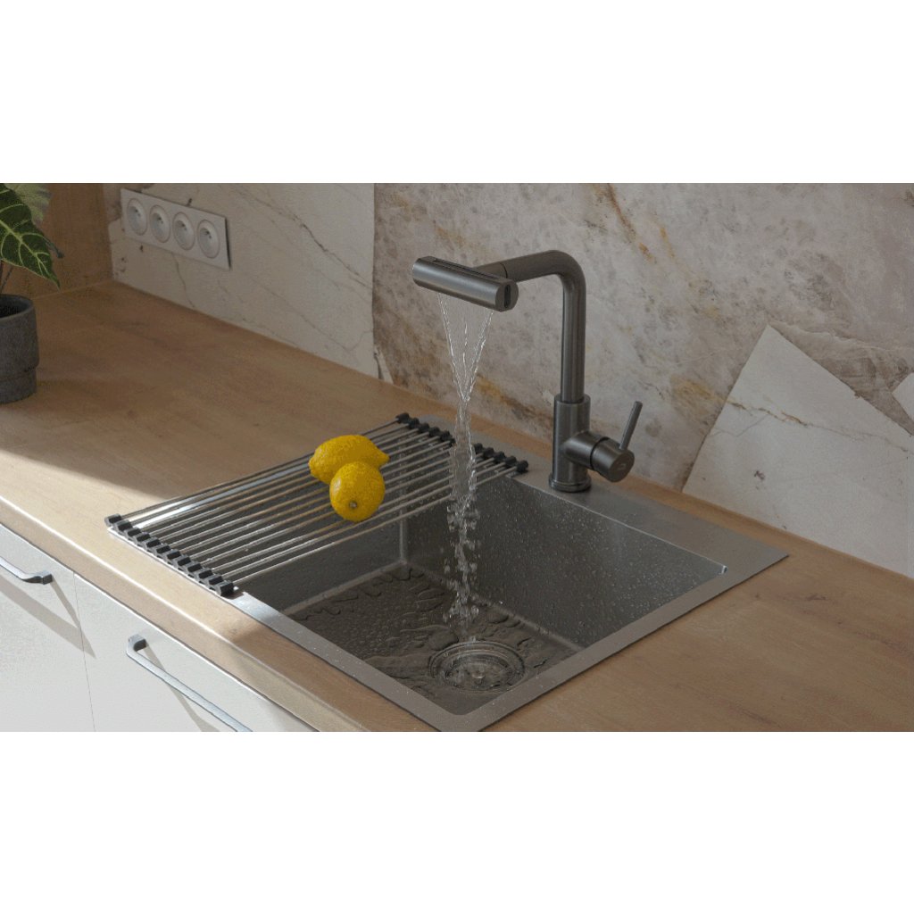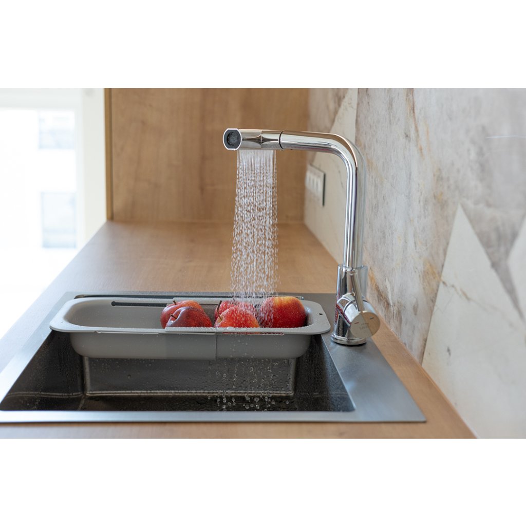 A Rotaro egy visszahúzható forgatható kifolyóval van felszerelve, amely teljes ellenőrzést biztosít a víz áramlása felett. Egyszerűen húzza ki a kifolyót egy mozdulattal, és kényelmesen töltse meg a nagy edényt, alaposan öblítse le a zöldségeket, vagy érje el a mosogató minden sarkát. Az intuitív áramláskapcsoló rendszernek köszönhetően egy kattintással beállíthatja a víz áramlását az igényeinek megfelelően.