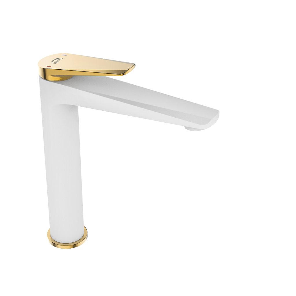 Laveo Rubio, h-267 magas mosdócsaptelep ClickClack leeresztő dugóval, fehér-arany fényes, LAV-BVR_62NG
