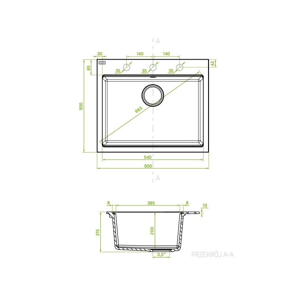 - A konyhai mosogató 3 előre fúrt lyukkal rendelkezik, amelyek lehetővé teszik az önürítést (csaptelep, mosószer-adagoló, automatikus leeresztőcsavar-vezérlés beszerelésének lehetősége)