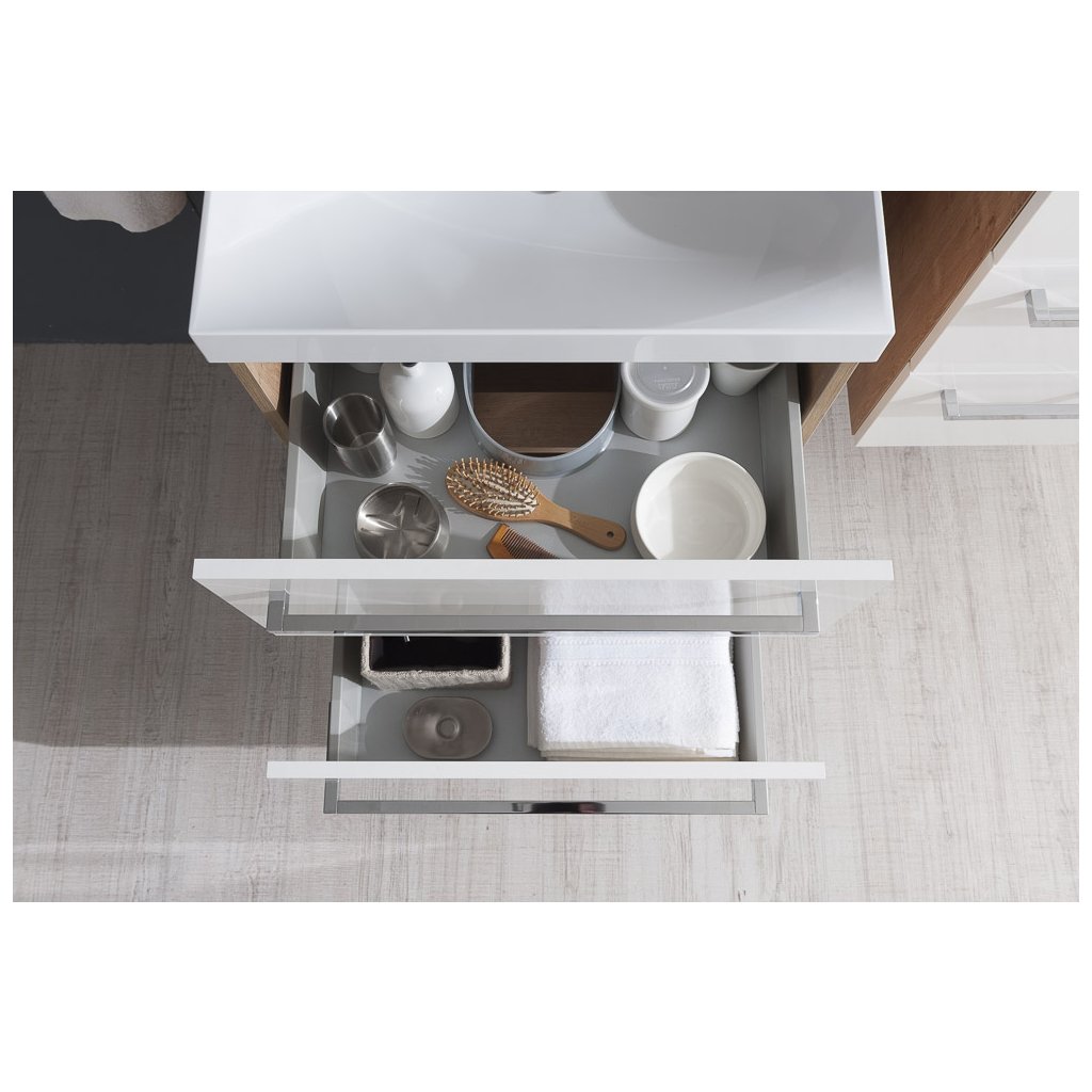 Egyszerűség, hatékonyság, elegancia. Ezek a Bino fürdőszobabútorok fő közös nevezői, amelyek minden fürdőszobát díszítenek. Az innováció és a megbízható megközelítés kombinációjának köszönhetően minőségi és egyben nagyon modern bútorok születnek. A fehér fényű, fehér fényű + tölgy színkombinációk biztosítják, hogy a bútorok bármilyen típusú fürdőszobához illeszkedjenek. Két teljesen kihúzható fiók önzáró csúszdákkal és erős csillapítással nagyon praktikus a felhasználó számára. A szekrényt összeszerelve szállítjuk.Kiegészítő paraméterek